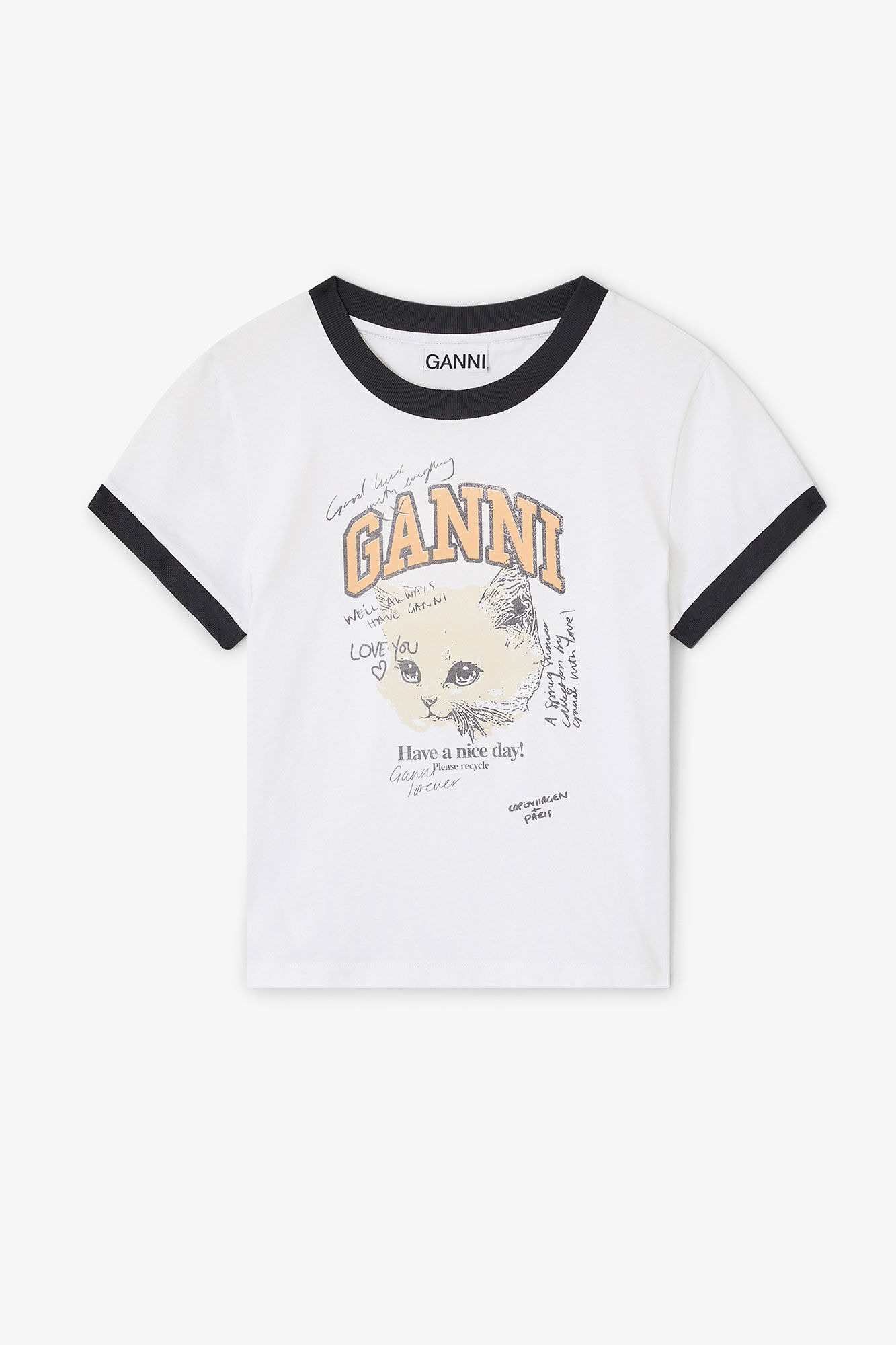 This T-shirt features a round neckline, short sleeves, and a GANNI logo. The T-shirt has a cat print graphic and a 'Have a nice day! Please recycle' message. DETAILS - 100% organic cotton. Learn more about our materials - Round neckline - Short sleeves - Contrast binding - Cat print graphic - GANNI logo - 'Have a nice day! Please recycle' message Made in: Portugal Product ID: T4336 SIZE & FIT - Fitted - Cropped - Lena is 5’9” and wears a size S - For personalised guidance on sizing and fit, contact our Customer Service team - here - .