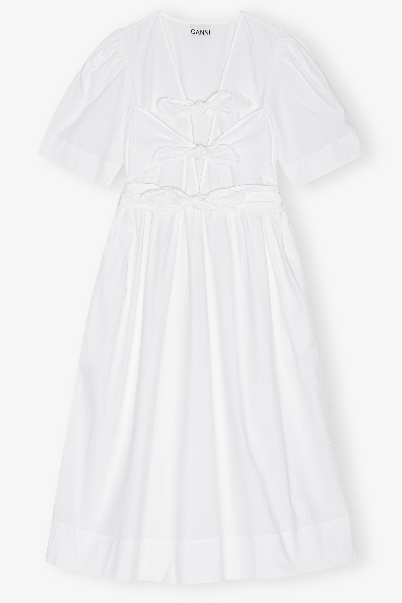 WHITE STRETCH COTTON TIE STRAP MIDI DRESS