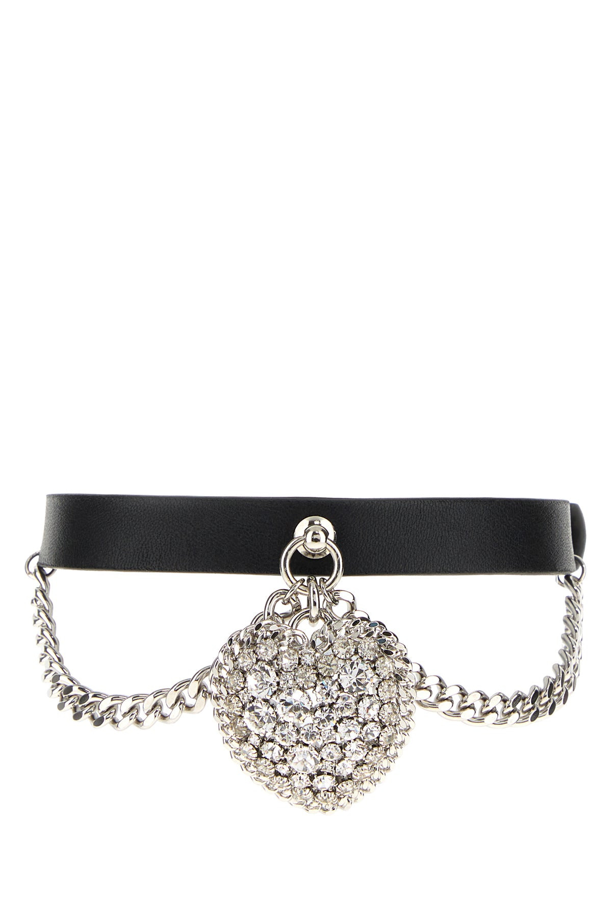 Choker realized in leather enriched by rhinestones Heart charm and metal chain. - Adjustable buckle closure DETAILS Black leather Heart choker Exterior: 100% Leather Finishing: Silver metal Made in italy Min circumference: 29 cm max circumference: 35,5 cm