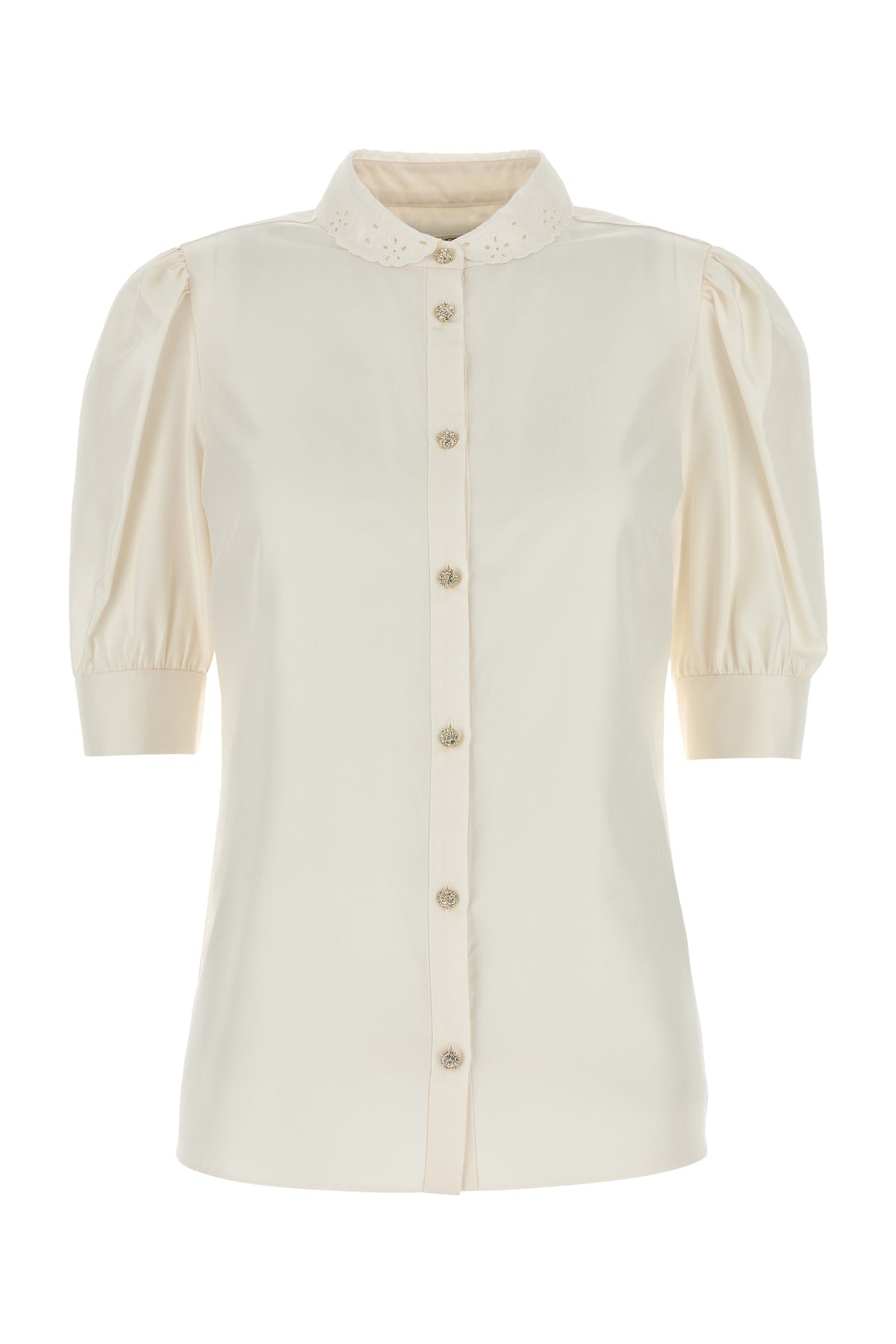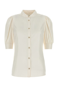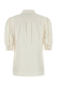 Short-sleeves shirt realized in pure silk satin characterized by peculiar collar. - Buttons closure - Angle cuffs with buttons - Rear yoke DETAILS Ivory satin shirt Exterior: 100% Silk Made in italy Sample size: 38