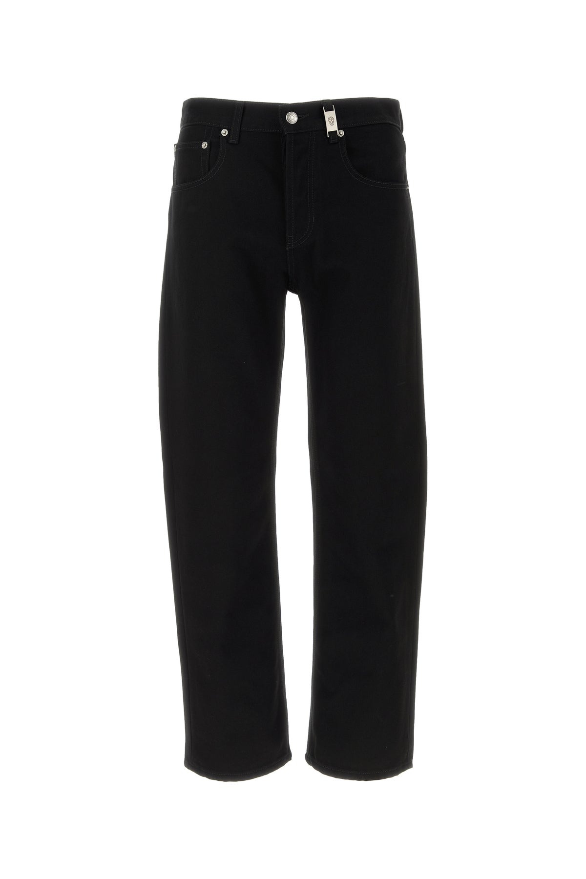 Jeans realized in pure cotton denim enriched by logoed metal plate at the front. - Belt loops at the waist - Concealed buttons and single visible button closure - Five classic pockets DETAILS Black denim jeans Exterior: 100% Cotton Made in italy Model is 190 cm and is wearing a size 48