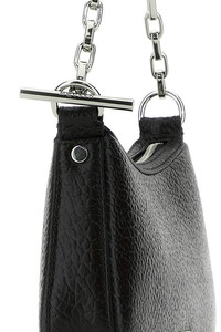 Handbag realized in pebble lamb leather enriched by metal lettering logo at the front. - Partially detachable metal chain handle - Zip closure - Lined interior with a credit card slot DETAILS Black leather mini T-Bar handbag Exterior: 100% Lamb Lining: 100% Nappa leather Finishing: Silver metal Made in italy Width: 21 cm Height: 12 cm Depth: 3,5 cm Handle height: 19 cm