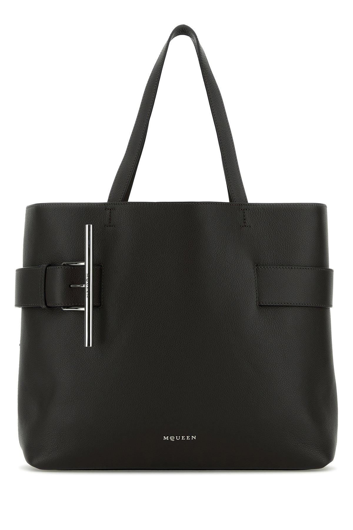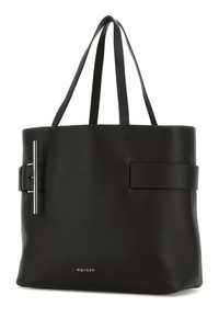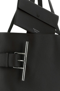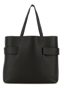 Shopping bag realized in pebble calf leather enriched by metal lettering logo and peculiar metal buckle at the front. - Two tonal leather flat handles - Lined interior with tonal leather pouch DETAILS Black leather T-Bar shopping bag Exterior: 100% Calf Lining: 100% Suede Finishing: Silver metal Made in italy Width: 37 cm Height: 32 cm Depth: 15,5 cm Handle height: 25 cm