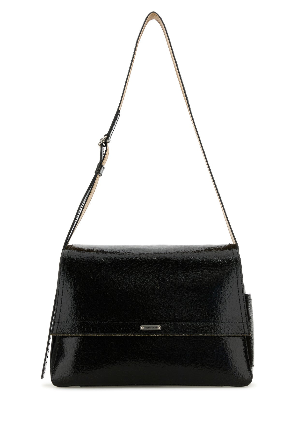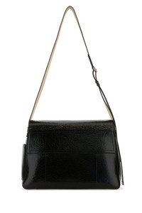 Crossbody bag realized in polished-finish craquele effect calf leather enriched by metal logoed plate at the front. - Adjustable tonal leather shoulder strap - Zip closure under the flap - A slit pocket on the side - Split-leather interior with a patch pocket and a credit card slot DETAILS Black leather The Slouch crossbody bag Exterior: 100% Calf Finishing: Silver metal Made in italy Width: 38 cm Height: 24 cm Depth: 12 cm Min shoulder strap length: 10 cm Max shoulder strap length: 68 cm