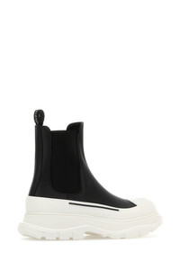 Ankle boots realized in nappa leather with elastic fabric inserts on the sides characterized by Alexander McQueen motif in relief on the side. - Rubber toe - Logoed pull-tab at the back - Embossed logo on the inside - Oversize contrasting rubber sole DETAILS Black nappa leather Tread Slick ankle boots Exterior: 100% Nappa leather Interior: 100% Leather Sole: Rubber Made in italy
