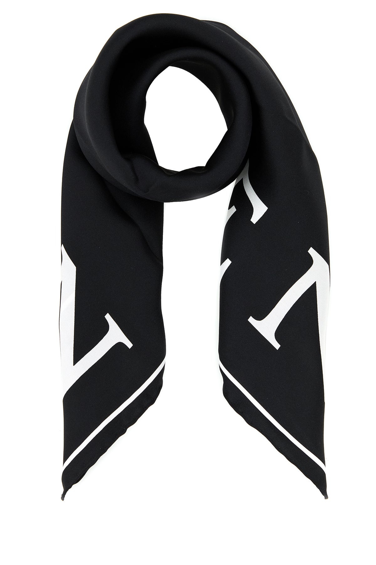 Foulard realized in pure silk characterized by contrasting logoed print at the front. - Rolled hems DETAILS Black silk foulard Exterior: 100% Silk Made in italy Width: 70 cm Height: 70 cm