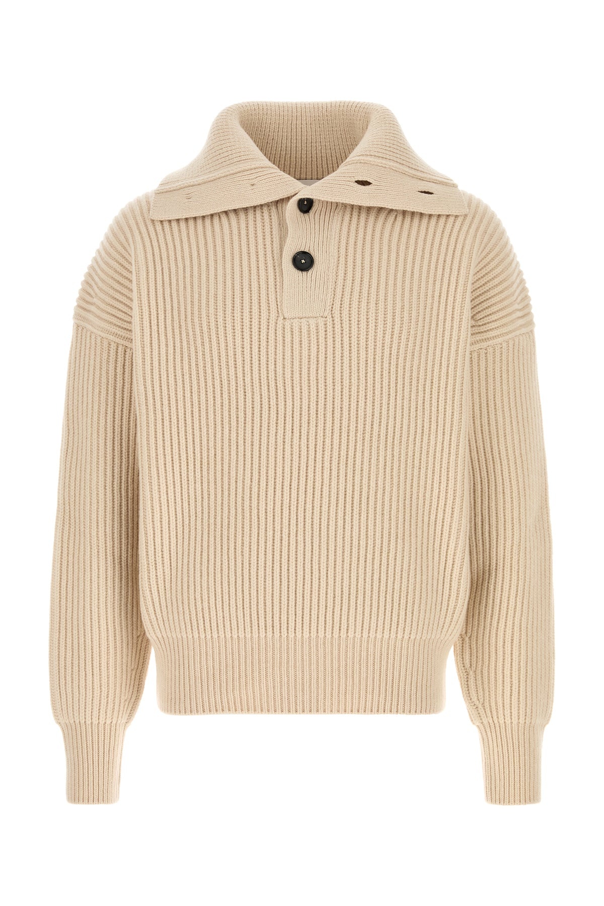 Sweater realized in pure cashmere characterized by collar. - Partial buttons closure - Ribbed cuffs and hemline DETAILS Sand cashmere sweater Exterior: 100% Cashmere Made in italy Sample size: M