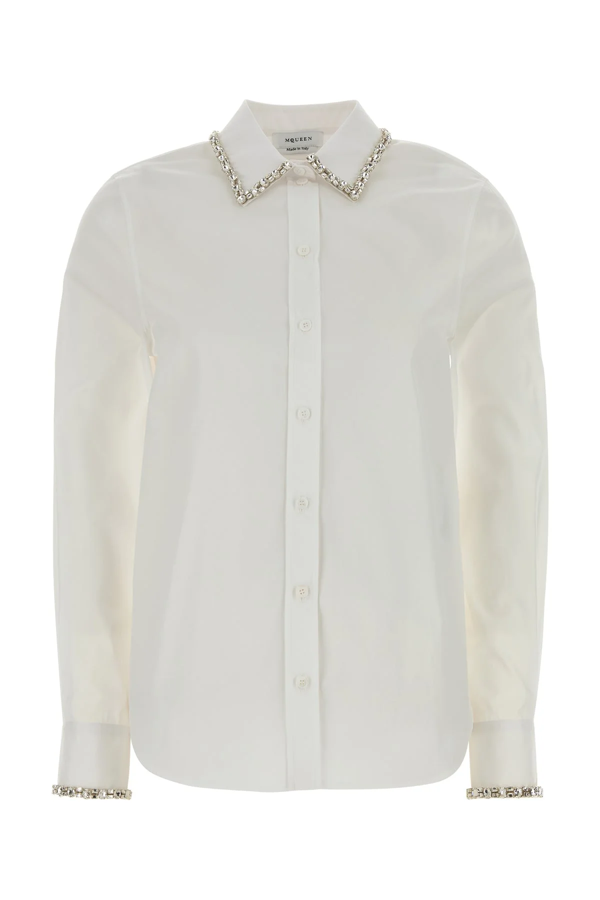 Shirt realized in pure cotton poplin enriched by jewel embellishment at the collar and on the cuffs. - Short-pointed collar - Buttons closure - Buttoned angle cuffs - Rear yoke DETAILS White poplin shirt Exterior: 100% Cotton Made in italy Sample size: 40