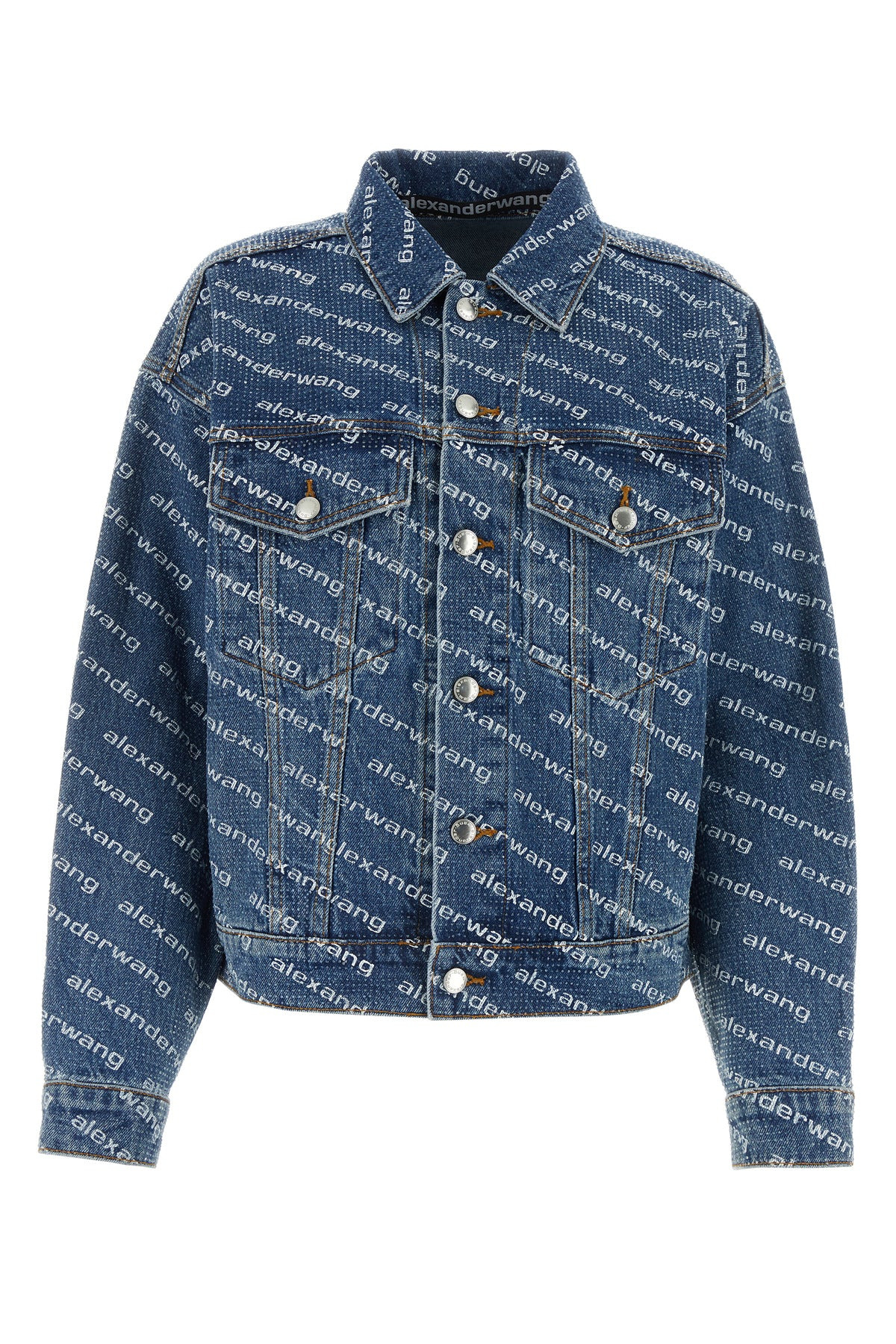 Oversize jacket realized in pure cotton denim entirely covered by rhinestones characterized by printed logo on the entire surface enriched by logoed label at the back. - Pointed collar - Buttons closure - Chest pockets and two slit pockets at the front - Buttoned cuffs - Adjustable straps on the hemline - Unlined DETAILS Exterior: 100% Cotton Made In China Sample size: XS