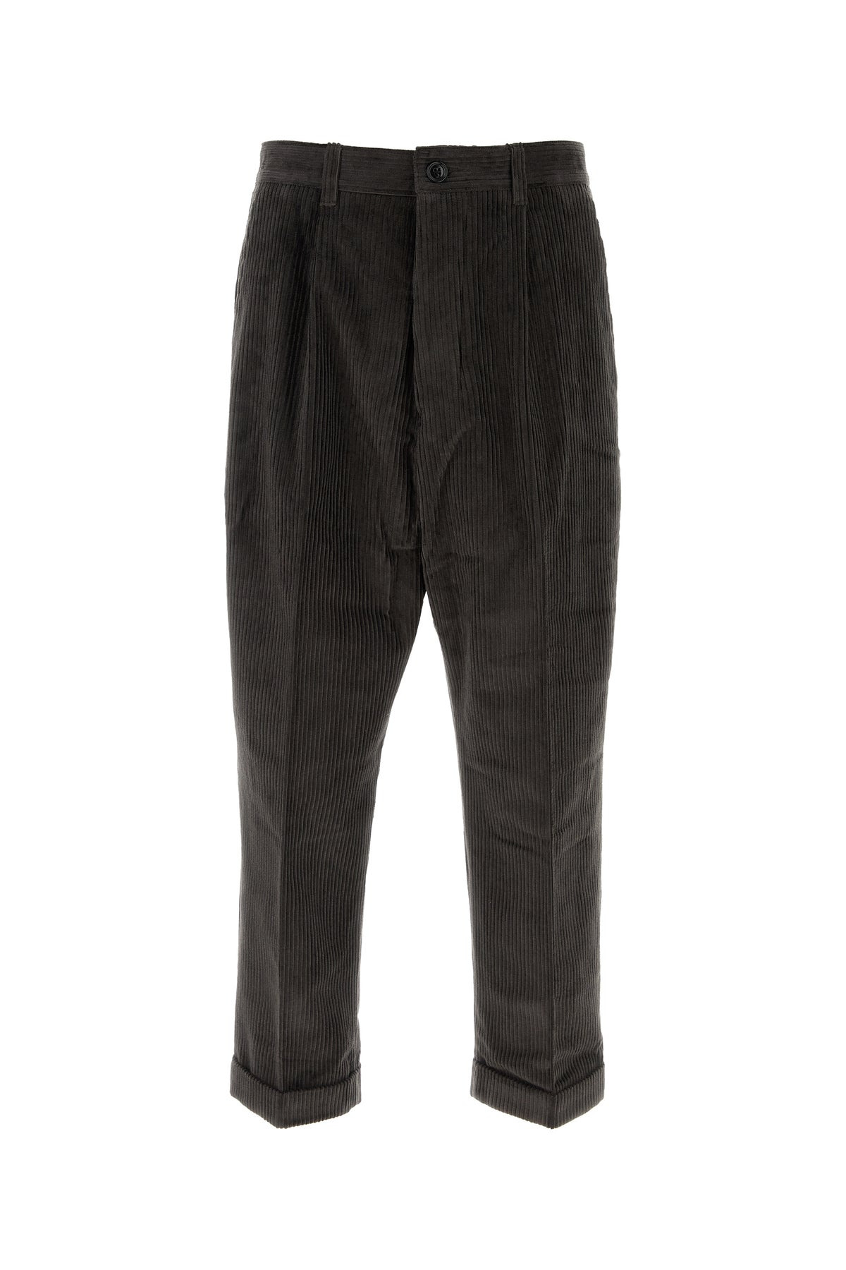 Pant realized in pure cotton corduroy enriched by logoed label a the back. - Belt loops at the waist - Concealed buttons and a single visible button closure - Slant pockets and two flap pockets at the back - Folded cuffs - Inverted pleats DETAILS Charcoal corduroy pant Exterior: 100% Cotton Made in portugal Sample size: M
