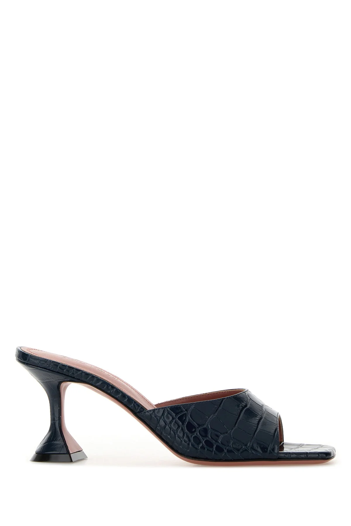 Mules realized in crocodile embossed leather characterized by peculiar heel. - Squared toe - Embossed logo on the inside DETAILS Navy blue leather Lupita mules Exterior: 100% Leather Interior: 100% Leather Sole: Leather and Rubber Made in italy Heel height: 7 cm