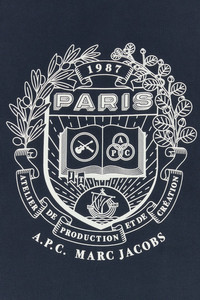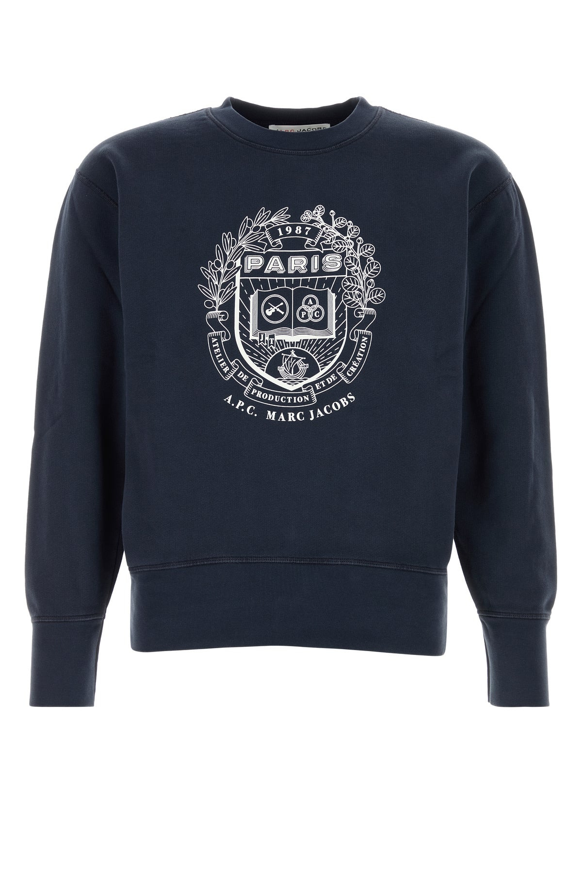 Sweatshirt created in collaboration with Marc Jacobs realized in pure cotton characterized by logoed print on at the front. - Ribbed crew-neck, cuffs and hemline - Logoed label on the side DETAILS Navy blue cotton A.P.C. x Marc Jacobs sweatshirt Exterior: 100% Cotton Made in portugal Sample size: M