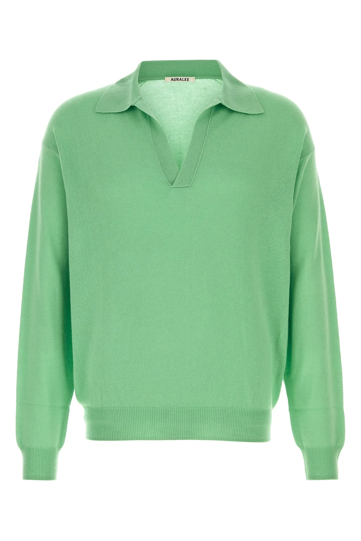 Long-sleeves polo shirt realized in cashmere and silk. - Collar - V neckline - Ribbed cuffs and hemline DETAILS Green wool and silk polo shirt Exterior: 50% Cashmere 50% Silk Made in italy Sample size: 4