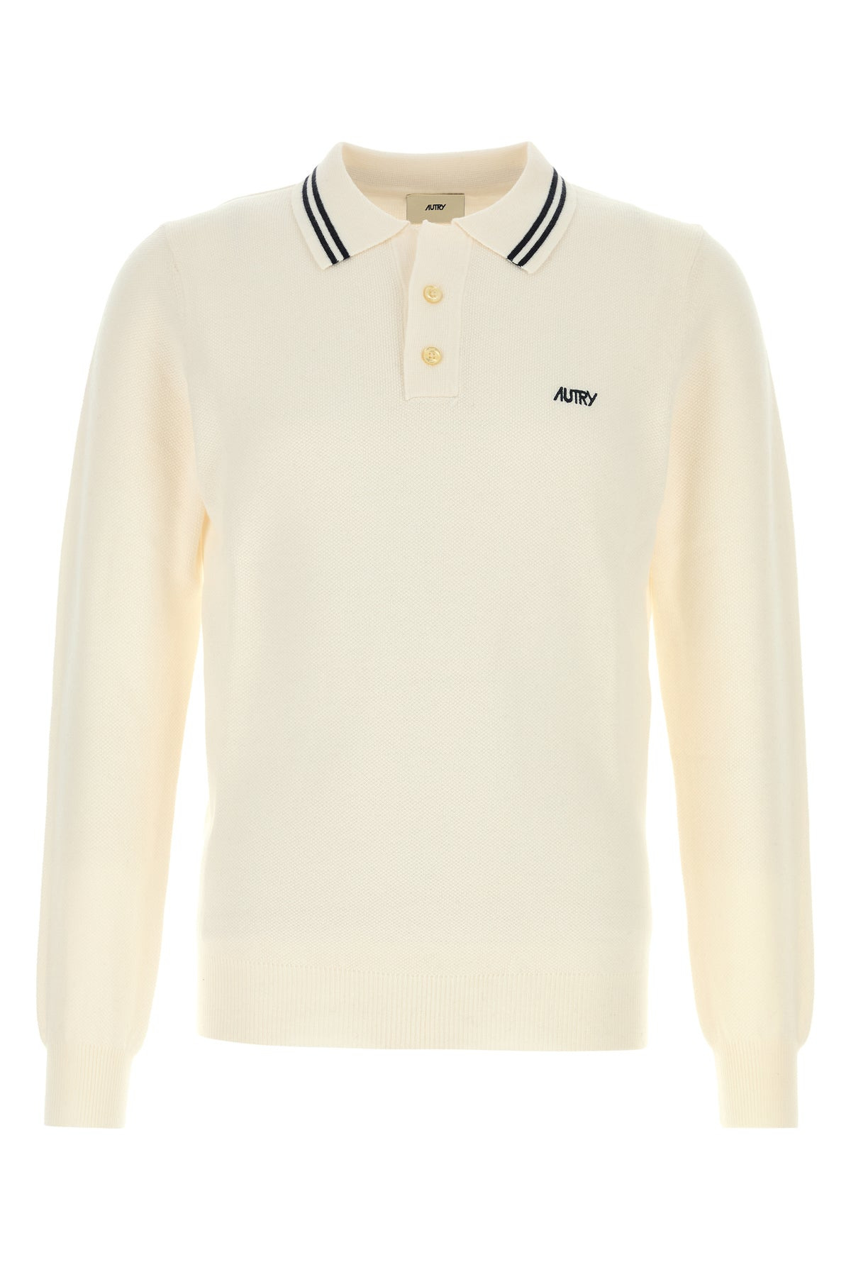 Polo shirt realized in merino wool and organic cotton knit characterized by contrasting embroidered logo on the chest. - Collar with contrasting bands - Partial buttons closure - Ribbed cuffs and hemline DETAILS Ivory knit polo shirt Exterior: 50% Merino wool 50% Organic cotton Made in china Sample size: M