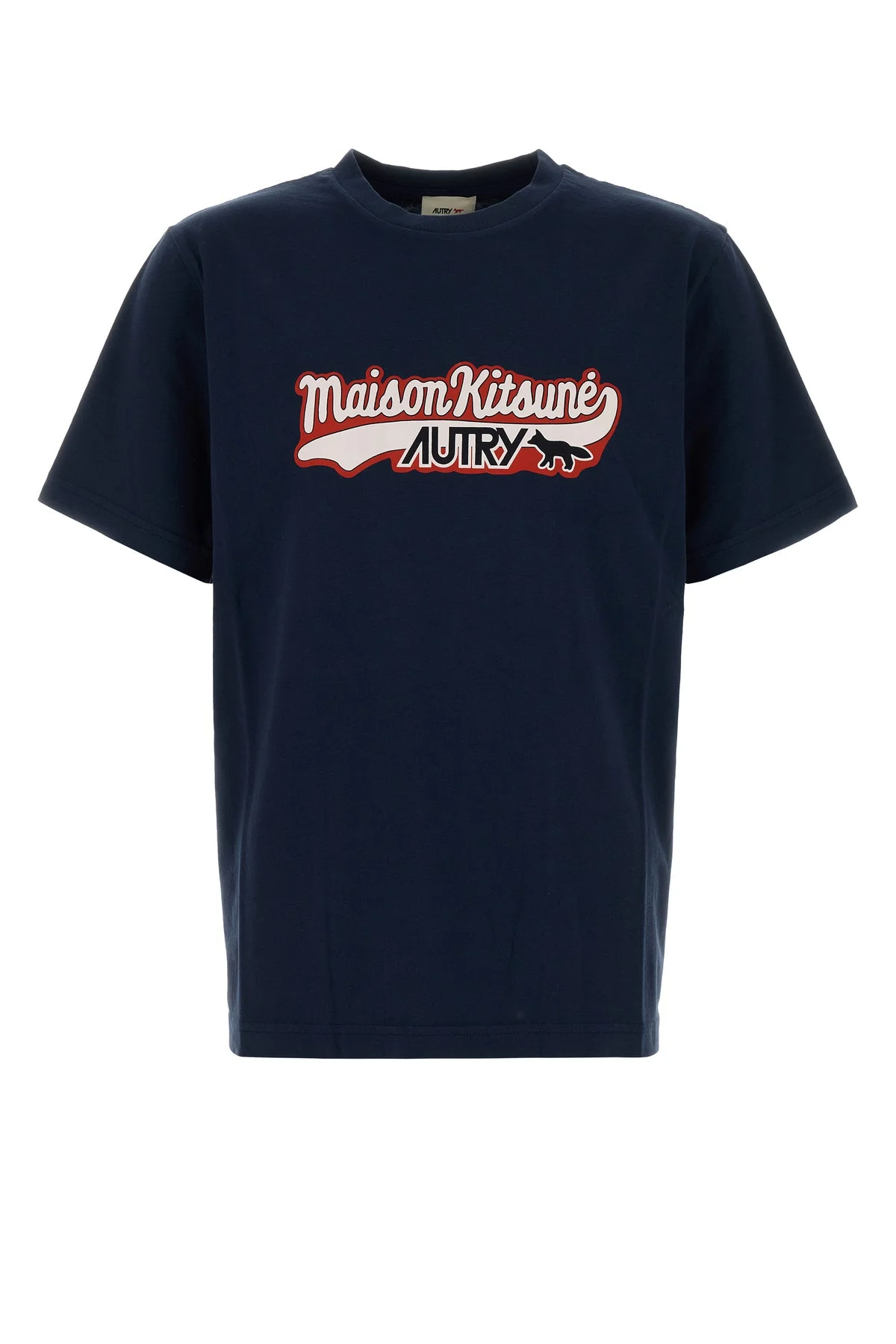 T-shirt created in collaboration with Maison Kitsune realized in pure cotton characterized by contrasting printed logo on the chest. - Ribbed crew-neck DETAILS Navy blue cotton Autry x Maison Kitsune t-shirt Exterior: 100% Cotton Made in italy Sample size: M