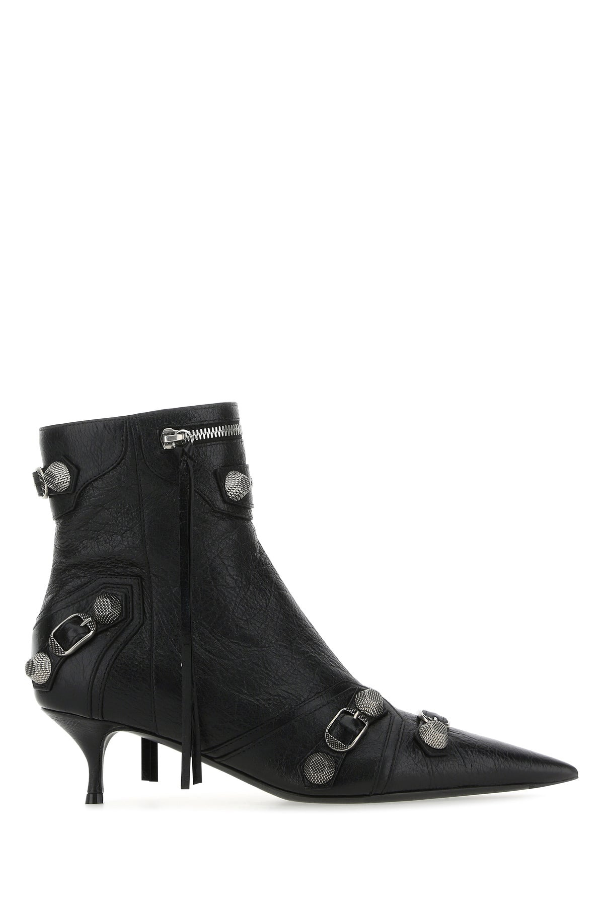 Ankle boots realized in Arena lamb leather enriched by metal studs and buckles on the entire surface. - Zip closure on the side - Pointed toe - Embossed logo on the inside - Stiletto heel DETAILS Exterior: 100% Lamb Interior: 100% Leather Sole: Leather Made In Italy Heel height: 5 cm