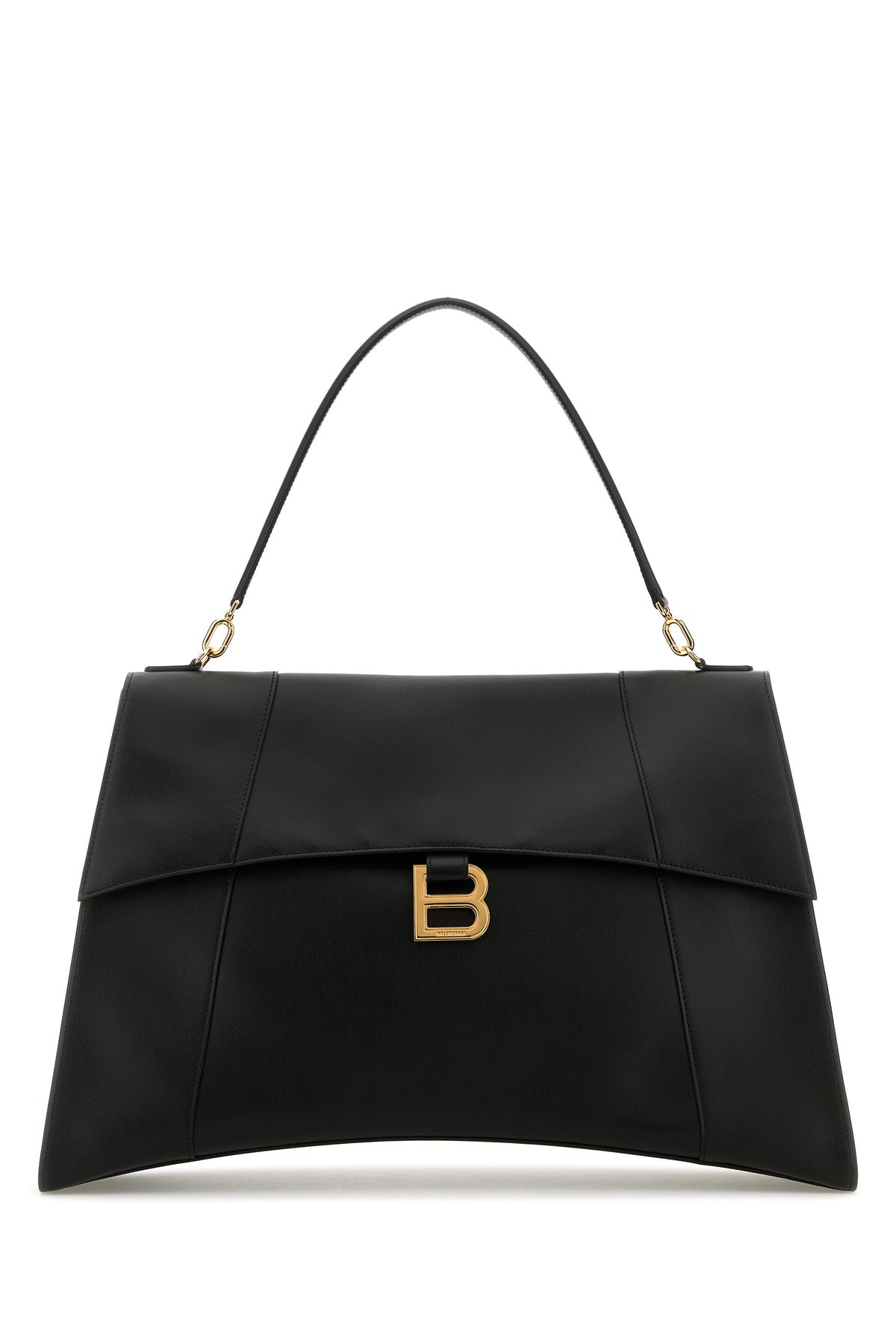 Handbag realized in slightly pebble calf leather enriched by metal B detail at the front. - Detachable tonal leather handle - Adjustable detachable tonal leather shoulder strap - Magnetic button closure - Two slit pockets at the back - Lined interior with a zip pocket DETAILS Black leather large Hourglass Soft handbag Exterior: 100% Calf Lining: 100% Leather Finishing: Golden metal Made in italy Width: 47 cm Height: 30 cm Depth: 18 cm Handle height 2: 22,5 cm Max shoulder strap length: 59 cm