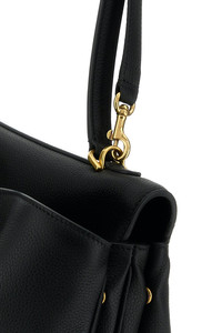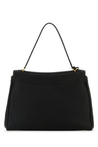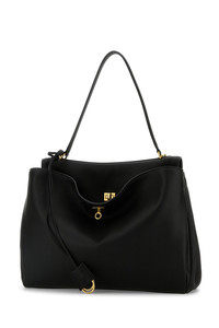 Handbag realized in pebble calf leather characterized by snap-fit closure. - A tonal leather flat handle - Detachable tonal leather shoulder strap - Two slit pockets at the back - Detachable leather keychain accessory - Lined interior with two gusseted compartments and a zip pocket - Side compression buttons for width adjustment - Protective metal feet at the base DETAILS Black leather large Rodeo handbag Exterior: 100% Leather Lining: 100% Leather Finishing: Antiqued golden metal Made in italy Width: 40 cm Height: 30 cm Depth: 13 cm Handle height: 23 cm Shoulder strap length: 57 cm