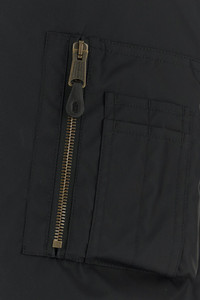 Bomber jacket realized in nylon enriched by peculiar logoed patch on the chest. - Ribbed crew-neck, cuffs and hemline - Zip closure - Two flap pockets at the front - Lined interior with two slit pockets DETAILS Black nylon bomber jacket Exterior: 100% Nylon Lining: 100% Polyester Padding: 60% Silk 40% Nylon Made in italy Sample size: 48