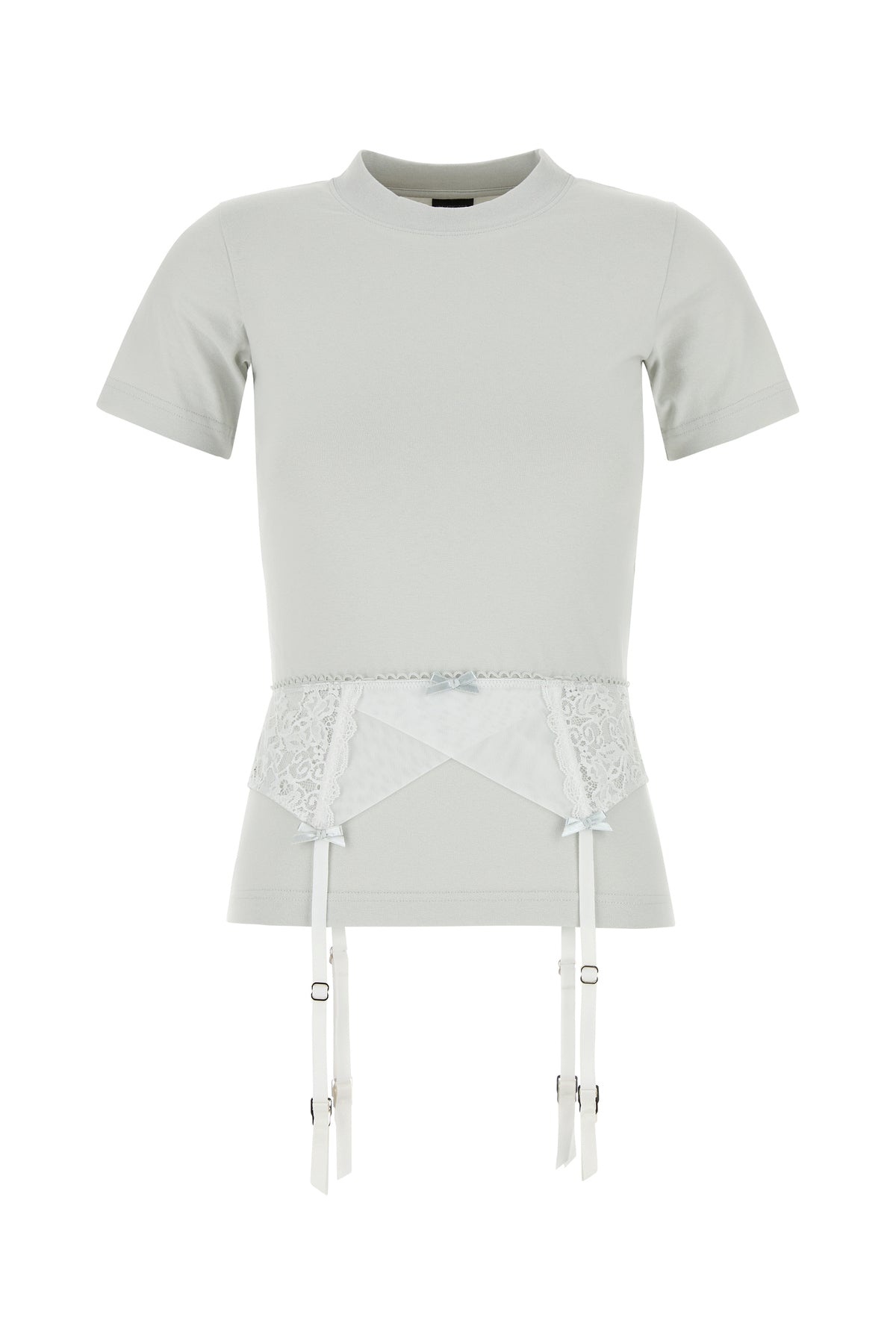 T-shirt realized in stretch cotton enriched by contrasting lace patch at the waist. - Ribbed crew-neck DETAILS Chalk stretch cotton t-shirt Exterior: 95% Cotton 5% Elastane Made in portugal Model is 170 cm and is wearing a size S