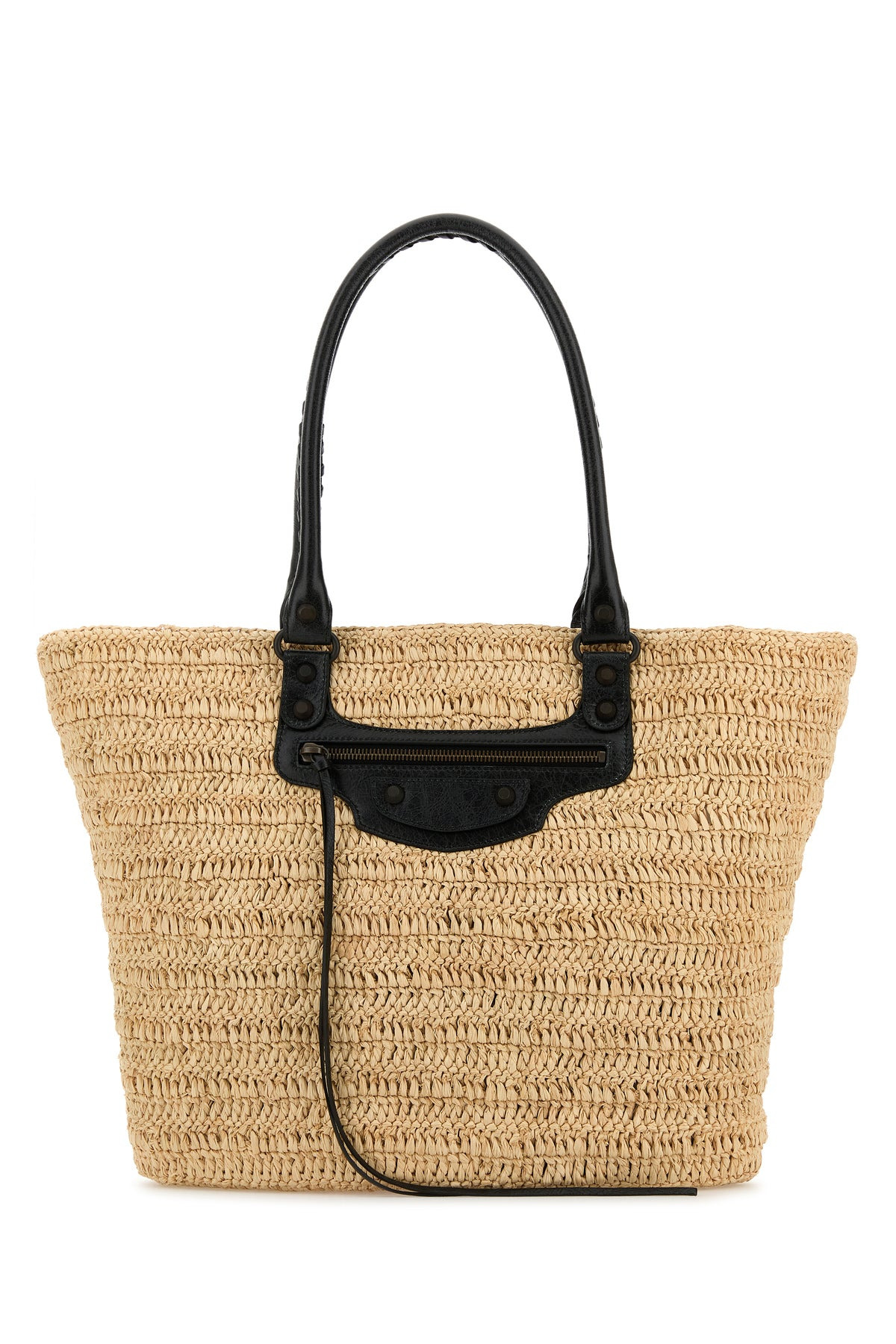 Shopping bag realized in woven raffia with Arena lamb leather inserts enriched by metal studs at the top. - Two leather round handles - A decorative pocket at the front - Unlined interior with a patch pocket DETAILS Raffia medium Le City shopping bag Exterior: 100% Raffia Finishing: Ruthenium Made in madagascar Width: 48 cm Height: 30 cm Depth: 13 cm Handle height: 22,5 cm
