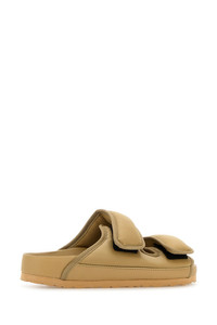 Slippers realized in fabric characterized by embossed logo on the side. - Round toe - Adjustable straps on the instep - Printed logo on the inside DETAILS Beige fabric Cosny slippers Exterior: 100% Fabric Interior: 100% Leather Sole: Rubber Made in germany