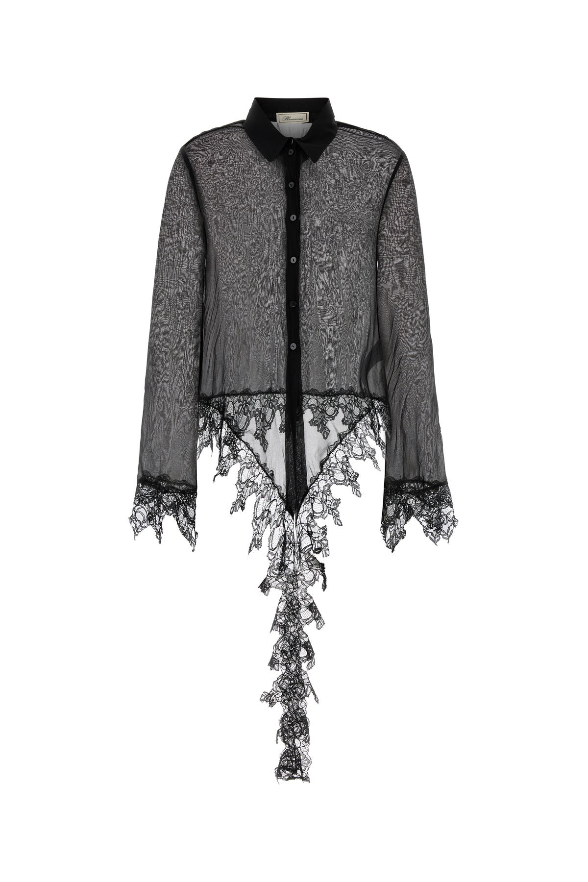 Shirt realized in chiffon with lace insert on the hemline and on the cuffs. - Short-pointed collar - Buttons closure DETAILS Black chiffon shirt Exterior: 100% Polyester Made in portugal Sample size: 40