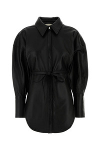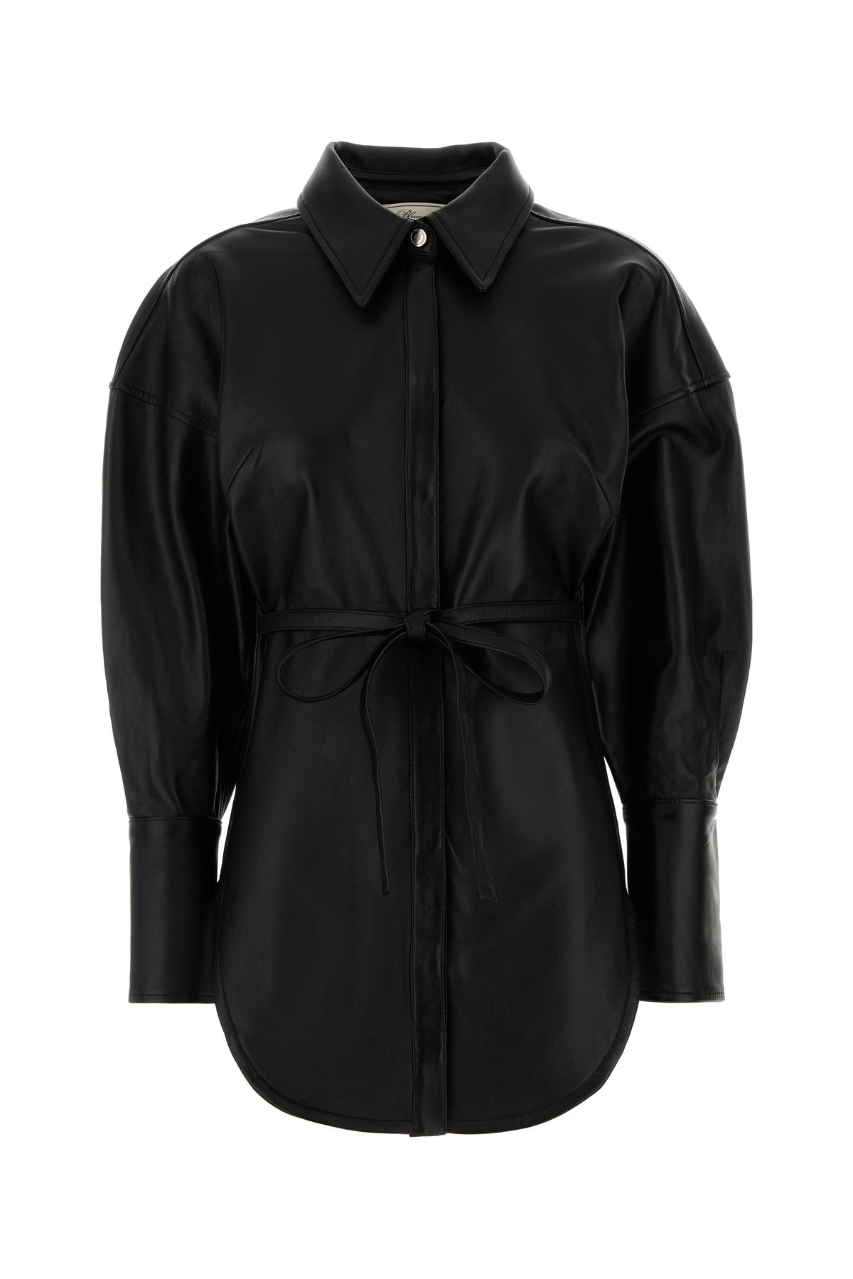 Shirt realized in lamb leather enriched by belt to tie at the waist. - Italian collar - Concealed snap buttons closure - Buttoned angle cuffs - Rounded hemline - Rear yoke DETAILS Black leather shirt Exterior: 100% Lamb Made in india Sample size: 38