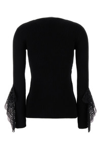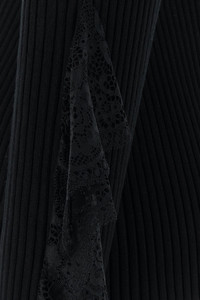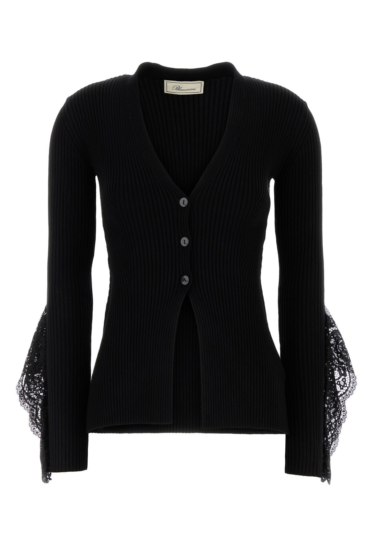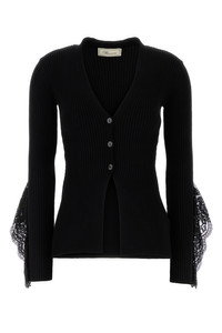 Cardigan realized in ribbed viscose blend enriched by tonal lace flounces on the cuffs. - Deep V neckline - Buttons closure DETAILS Black viscose blend cardigan Exterior: 72% Viscose 28% Polyester Made in china Sample size: XS