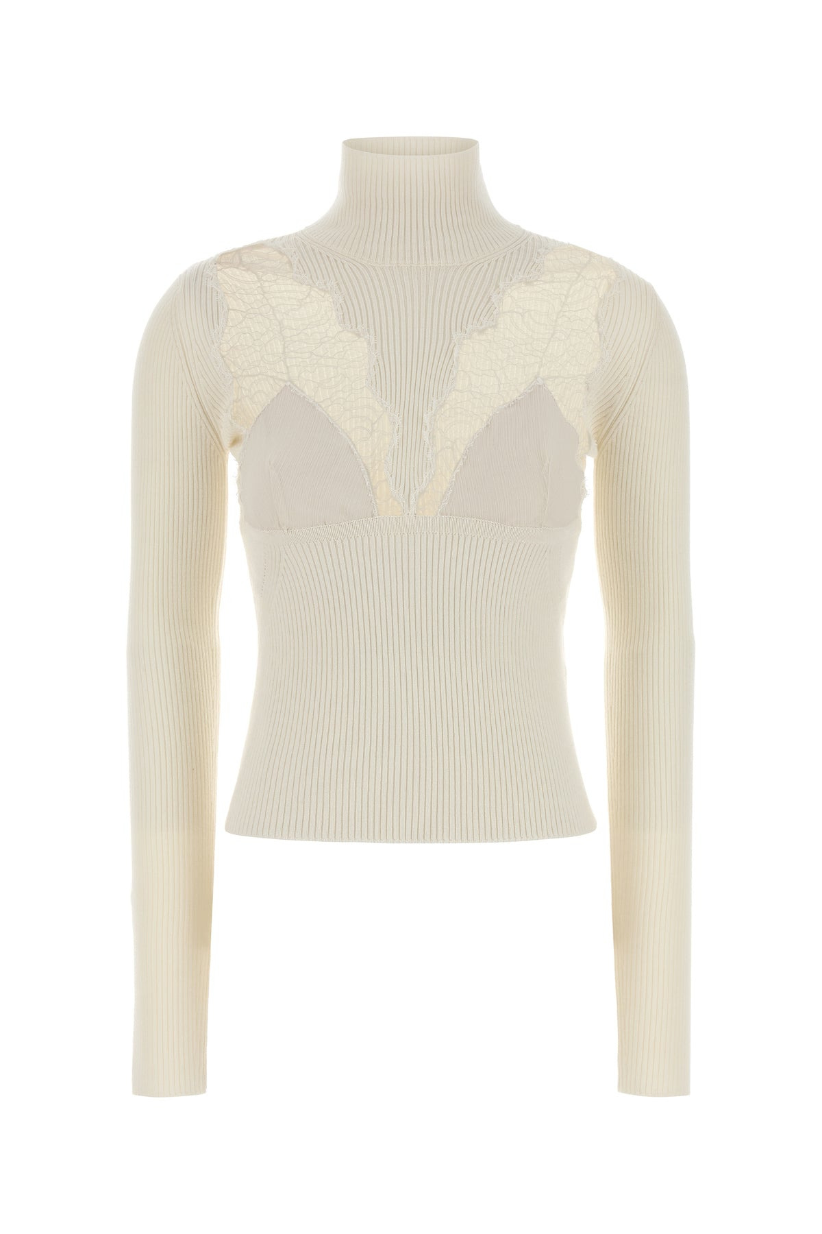 Sweater realized in ribbed wool blend enriched by tonal satin and lace inserts at the front. - High neck DETAILS Ivory wool blend sweater Exterior: 87% Wool 10% Nylon 3% Elastane Made in italy Sample size: S