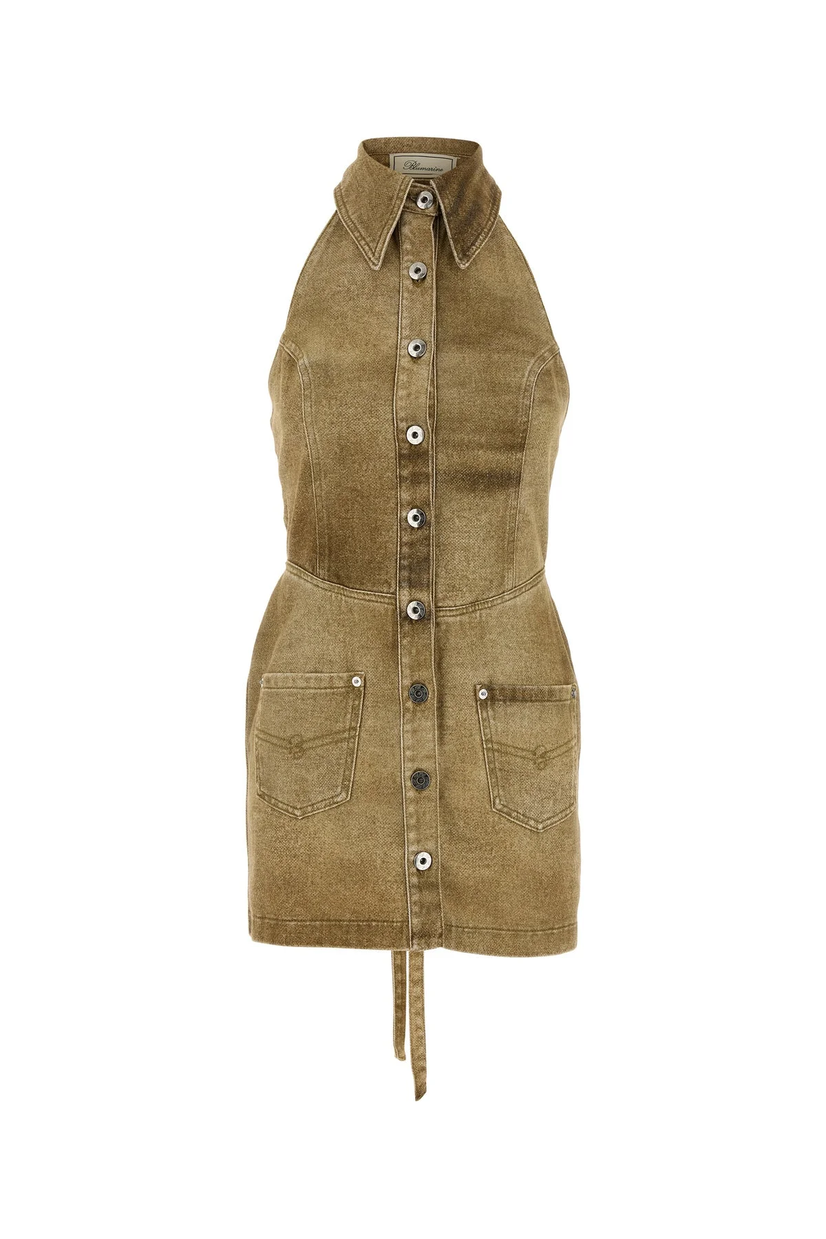Mini dress realized in pure cotton characterized by tie-dye print on the entire surface. - Pointed collar - Halter neckline - Backless with adjustable straps - Buttons closure at the front - Two patch pockets at the front and two slit pockets at the back - Unlined DETAILS Printed denim mini dress Exterior: 100% Cotton Made in italy Sample size: 38