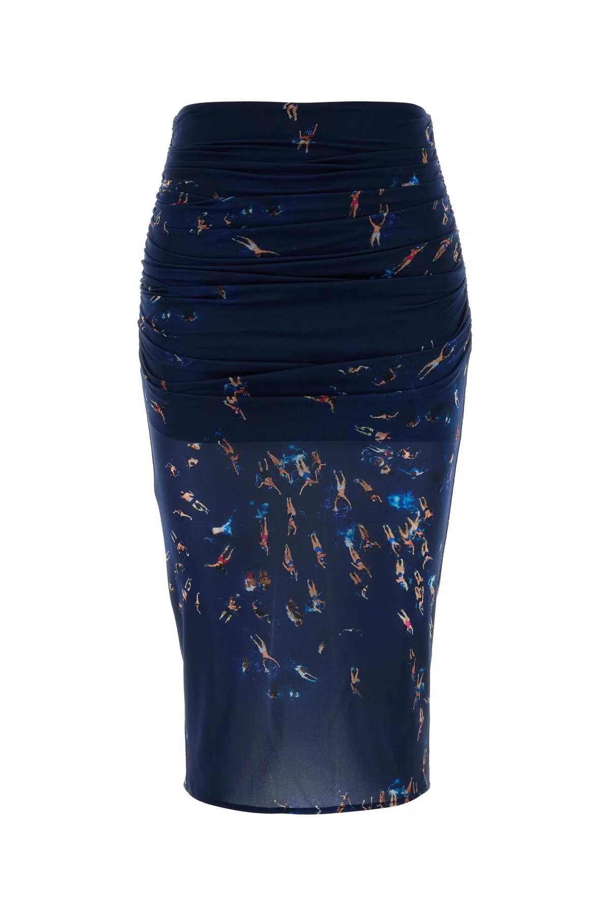 Midi-length skirt realized in stretch nylon characterized by peculiar print on the entire surface. - Gathered - Partially lined DETAILS Printed stretch nylon skirt Exterior: 90% Nylon 10% Elastane Lining: 75% Nylon 25% Elastane Made in italy Sample size: 38