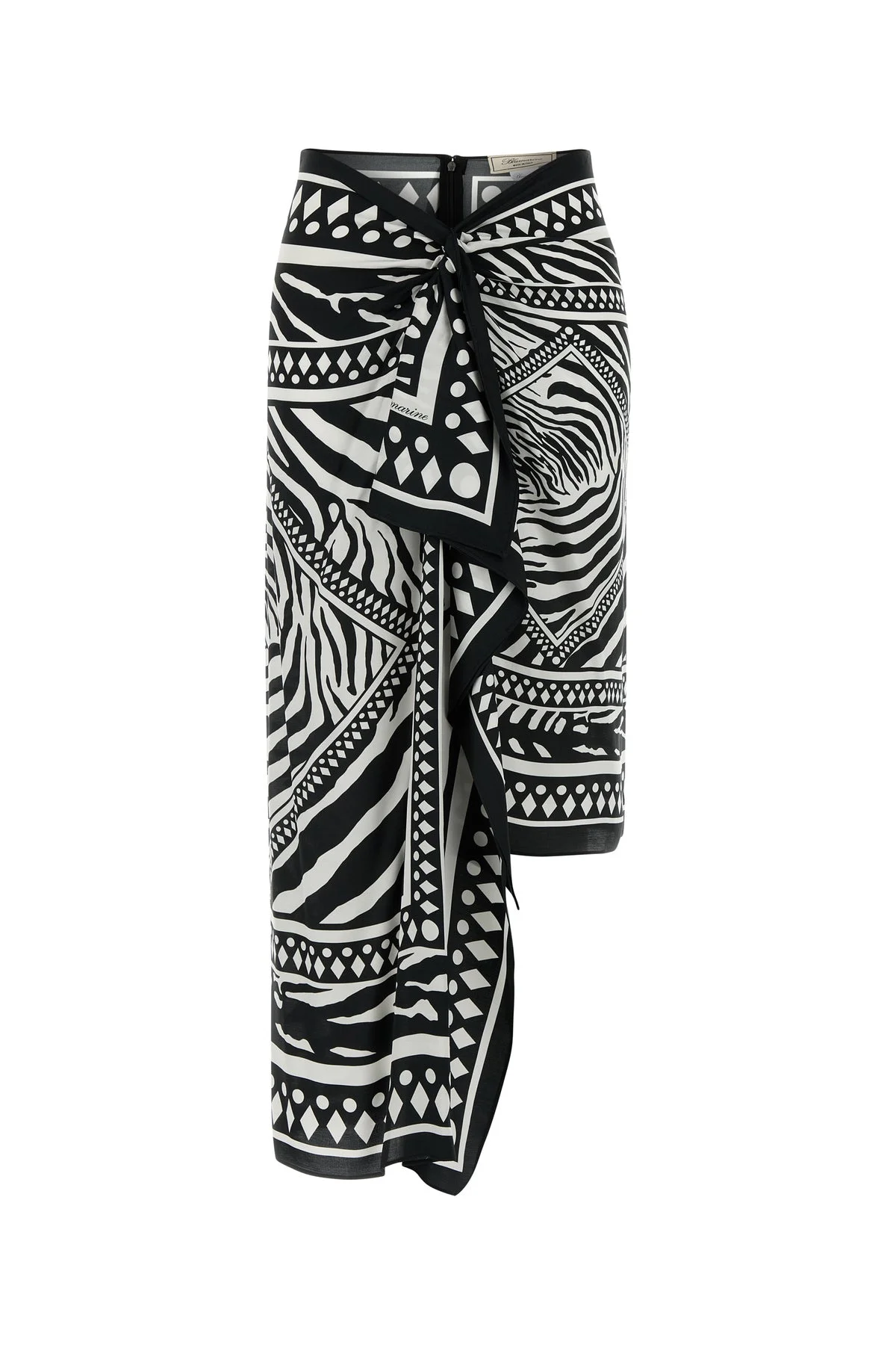 Asymmetric skirt realized in viscose twill characterized by Foulard print on the entire surface. - Concealed zip closure at the back - Draped ruffle at the waist - Unlined DETAILS Printed twill skirt Exterior: 100% Viscose Made in italy Sample size: 40