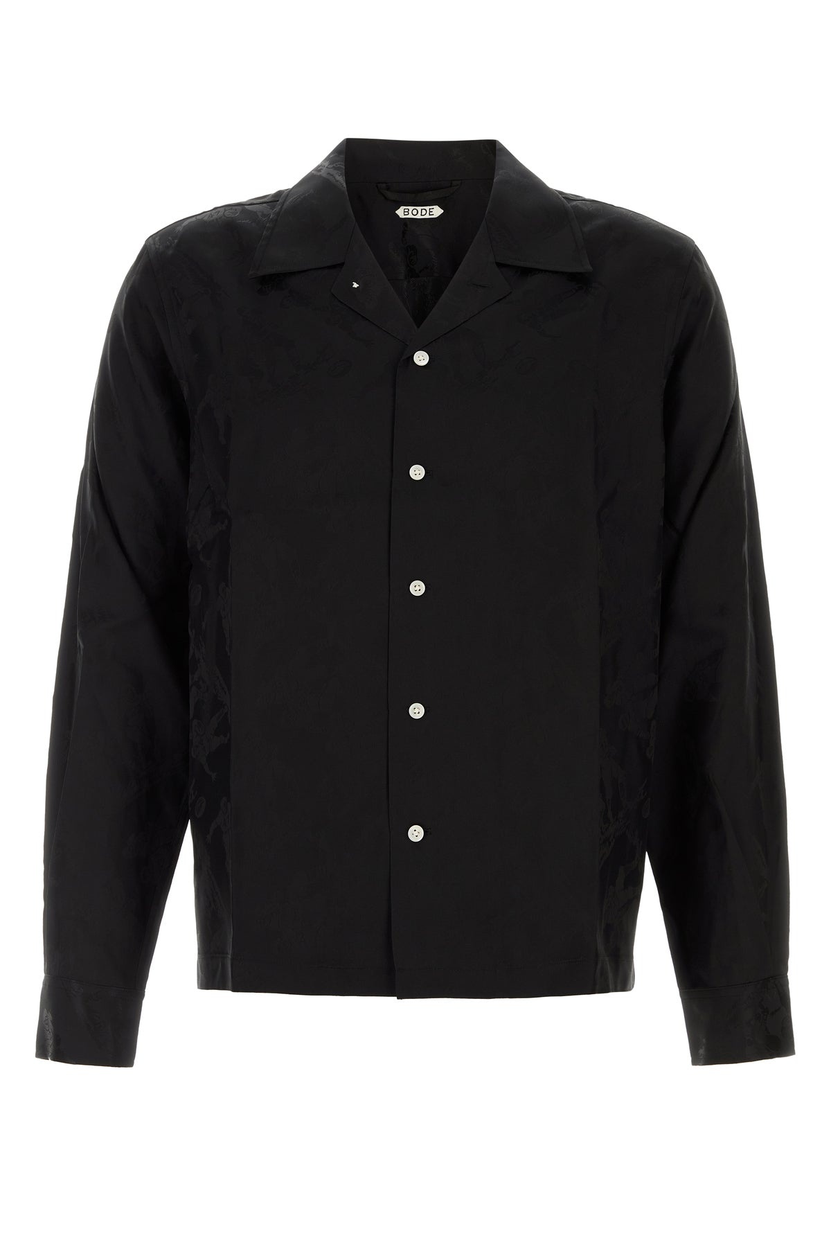 Shirt realized in jacquard characterized by peculiar tonal embroidery on the entire surface. - Notched lapels - Buttons closure - Angle cuffs with buttons - Rear yoke DETAILS Black jacquard Football shirt Exterior: 87% Viscose 13% Silk Made in portugal Sample size: M
