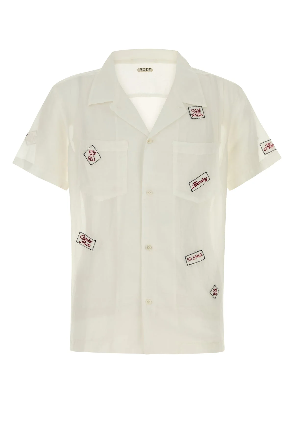 Short-sleeves shirt realized in cotton and silk characterized by “Silence,” “Ring My Bell,” “Tickle These Ivories” embroideries on the entire surface. - Notched collar - Buttons closure - Rear yoke DETAILS White cotton blend On Air shirt Exterior: 83% Cotton 17% Silk Made in india Sample size: M