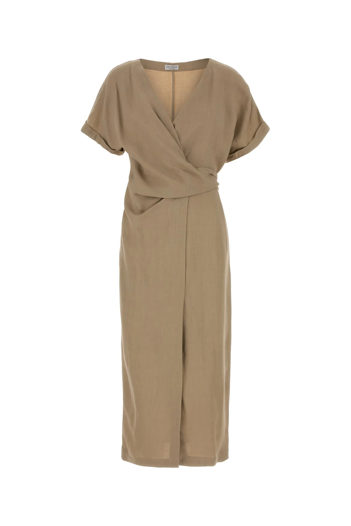 Midi-length dress realized in viscose and linen jersey. - V neckline - Short sleeves - Wrap closure by concealed button and belt to tie at the waist - Folded cuffs - Unlined DETAILS Cappuccino jersey dress Exterior: 72% Viscose 28% Linen Made in italy Sample size: S