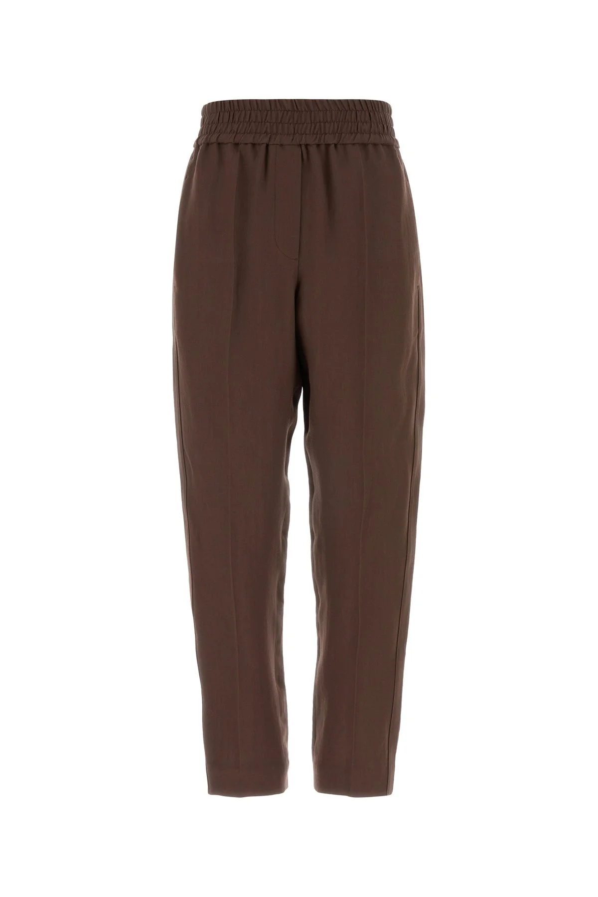 Pant realized in viscose blend characterized by central ironed pleats. - Elastic waist - Seam pockets and two slit pockets at the back DETAILS Chocolate viscose blend pant Exterior: 78% Viscose 22% Linen Made in italy Sample size: 38