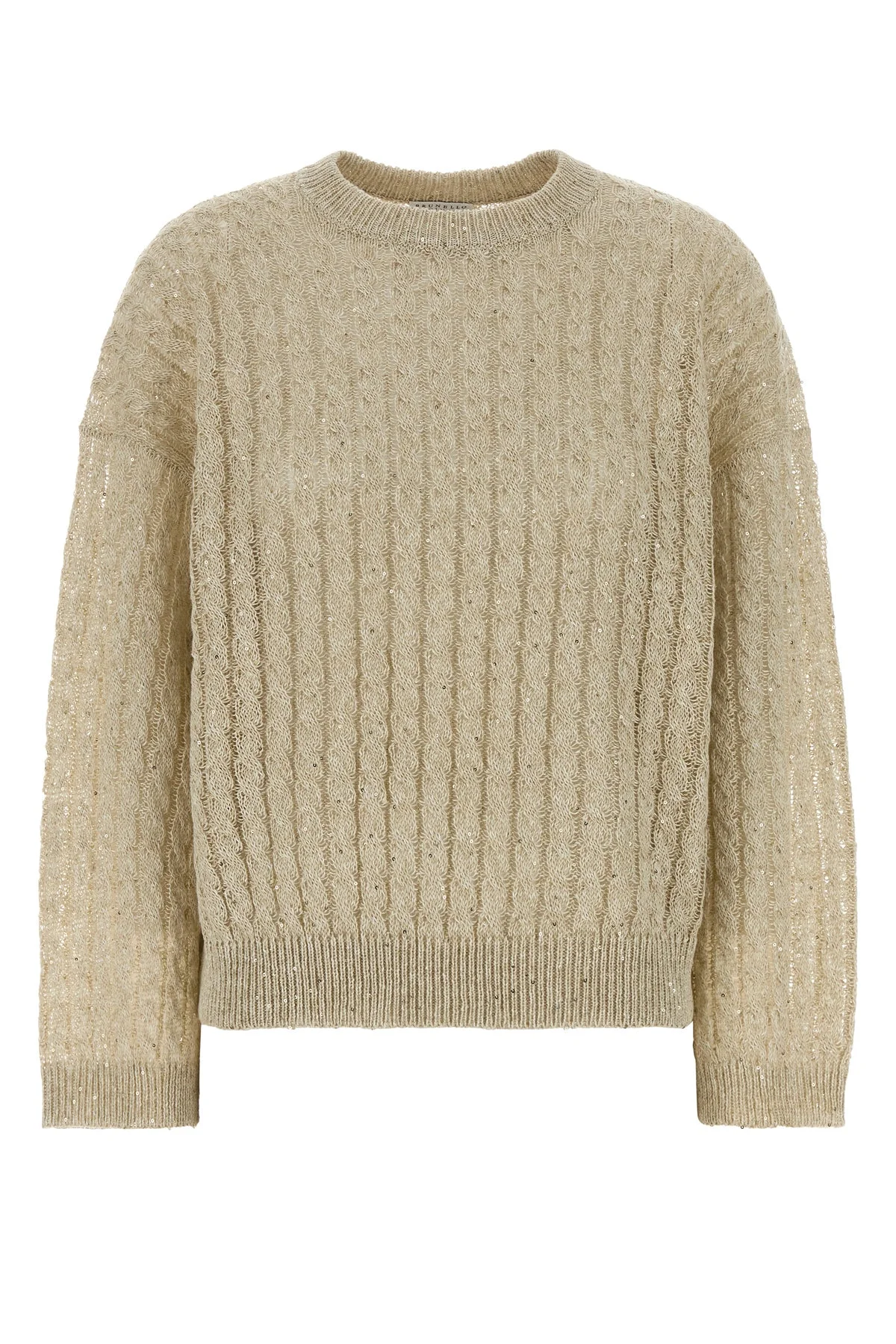 Knitted sweater realized in linen blend entirely covered by sequins. - Ribbed crew-neck, cuffs and hemline DETAILS Sand linen blend sweater Exterior: 94% Linen 6% Nylon Made in italy Sample size: XS