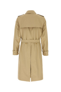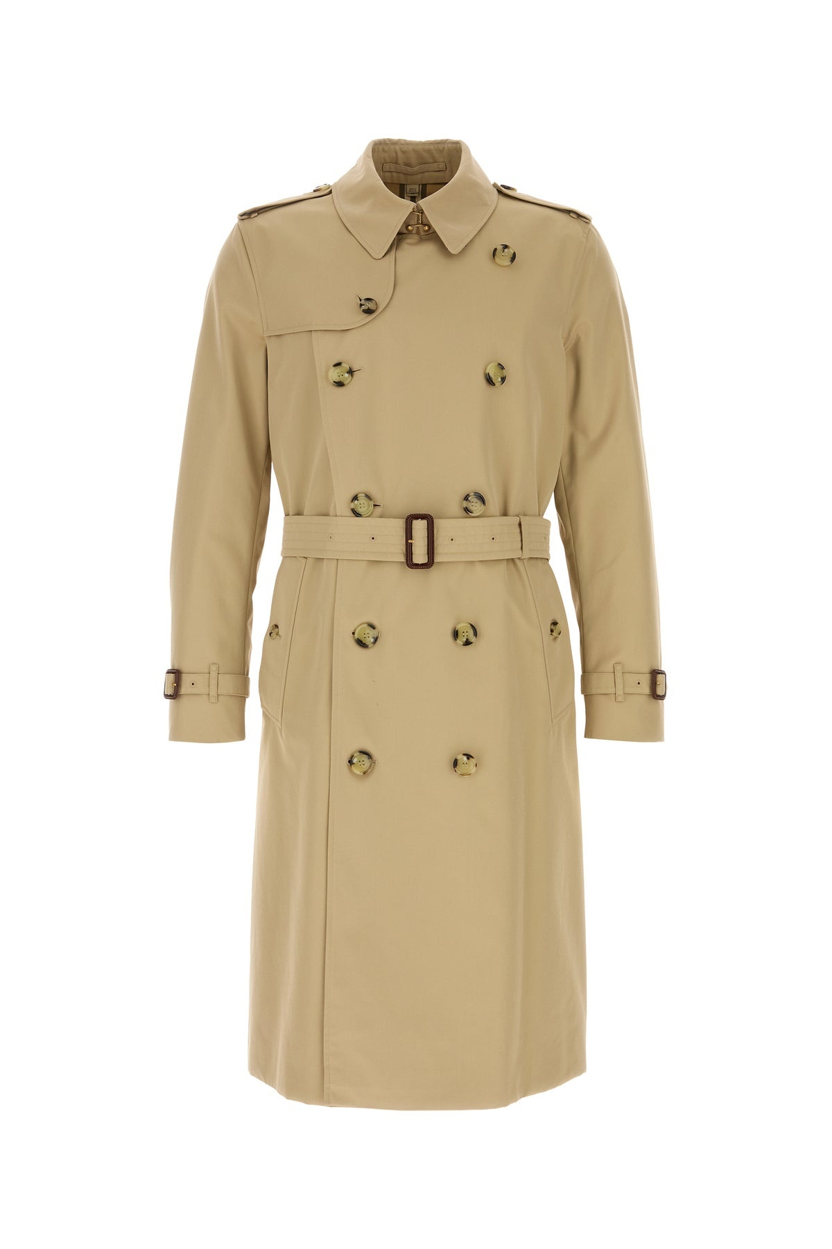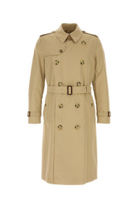 Long-cut trench coat realized in pure cotton enriched by detachable belt with leather buckle. - Pointed collar - Chin strap - Buttons closure - Two slit pockets at the front - Adjustable detachable straps on the cuffs - Central slit at the back - Gun flap and storm shield - Lined interior with Burberry Check motif DETAILS Beige cotton Heritage Kensington trench coat Exterior: 100% Cotton Lining: 100% Cotton Made in england Sample size: 48