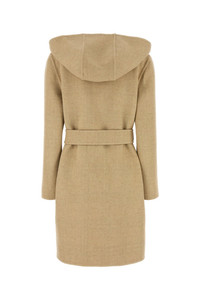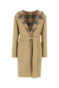 Reversible coat realized in pure wool characterized by hood. - Belt to tie closure at the waist - Two patch pockets at he front - Contrasting interior with two slit pockets DETAILS Beige wool reversible coat Exterior: 100% Wool Made in italy Sample size: 6
