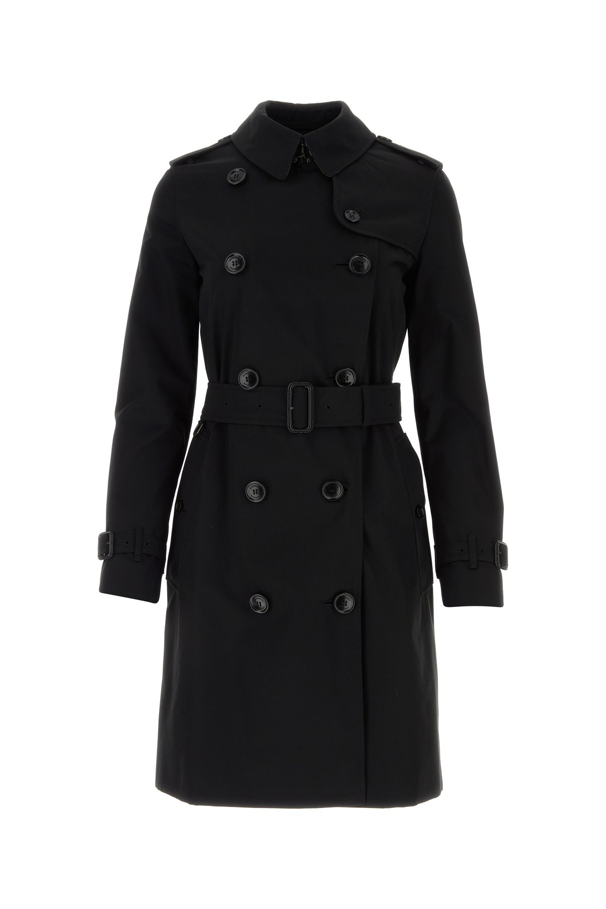Trench coat realized in pure cotton gabardine characterized by collar. - Buttons closure at the front - Two slit pockets at the front - Tonal fabric belt - Central slit at the back - Lined interior with a slit pocket DETAILS Black gabardine trench coat Exterior: 100% Cotton Lining: 100% Viscose Made in uk Sample size: 4