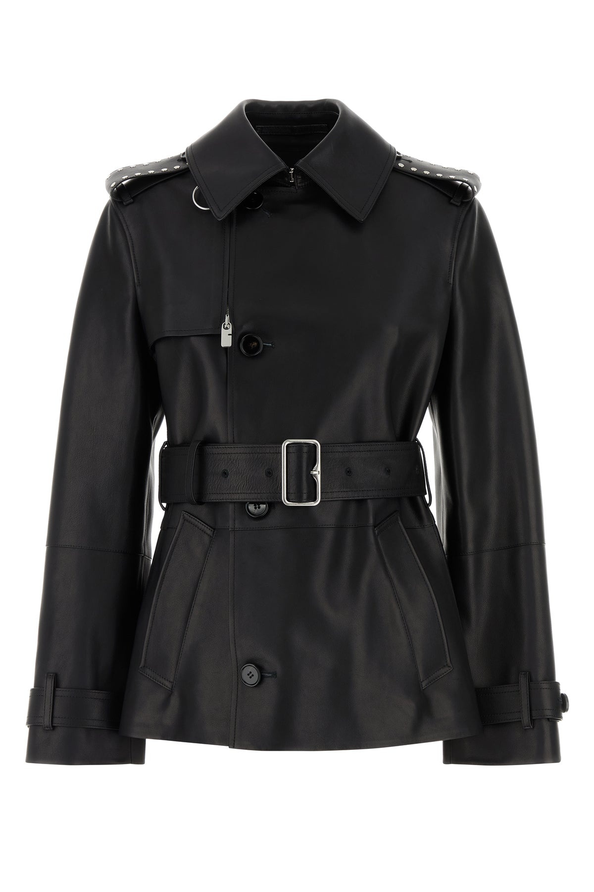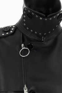 Jacket realized in slightly pebble calf leather enriched by metal studs on the chin strap and on the epaulettes. - Collar - Buttons closure - Leather belt at the waist - Two slit pockets at the front - Adjustable straps on the cuffs - Storm shield - Unlined DETAILS Black leather jacket Exterior: 100% Calf Made in italy Model is 174 cm and is wearing a size 10