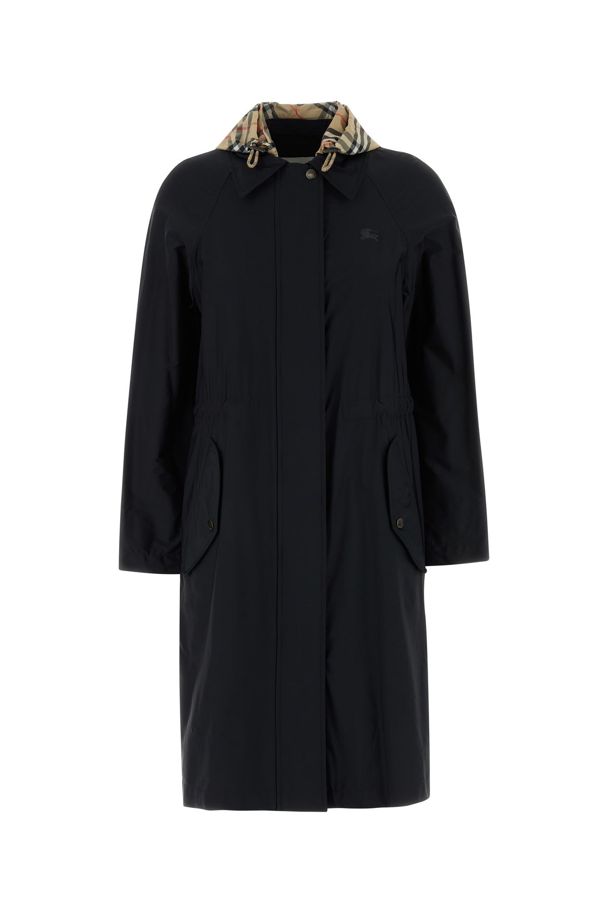 Parka coat realized in stretch nylon characterized by tonal Equestrian Knight print on the chest. - Detachable Burberry Check motif hood with drawstring - Pointed collar - Concealed zip and buttons closure - Two flap pockets at the front - Adjustable straps on the cuffs - Unlined DETAILS Black stretch nylon Newbury parka coat Exterior: 92% Nylon 8% Elastane Made in thailand Sample size: S