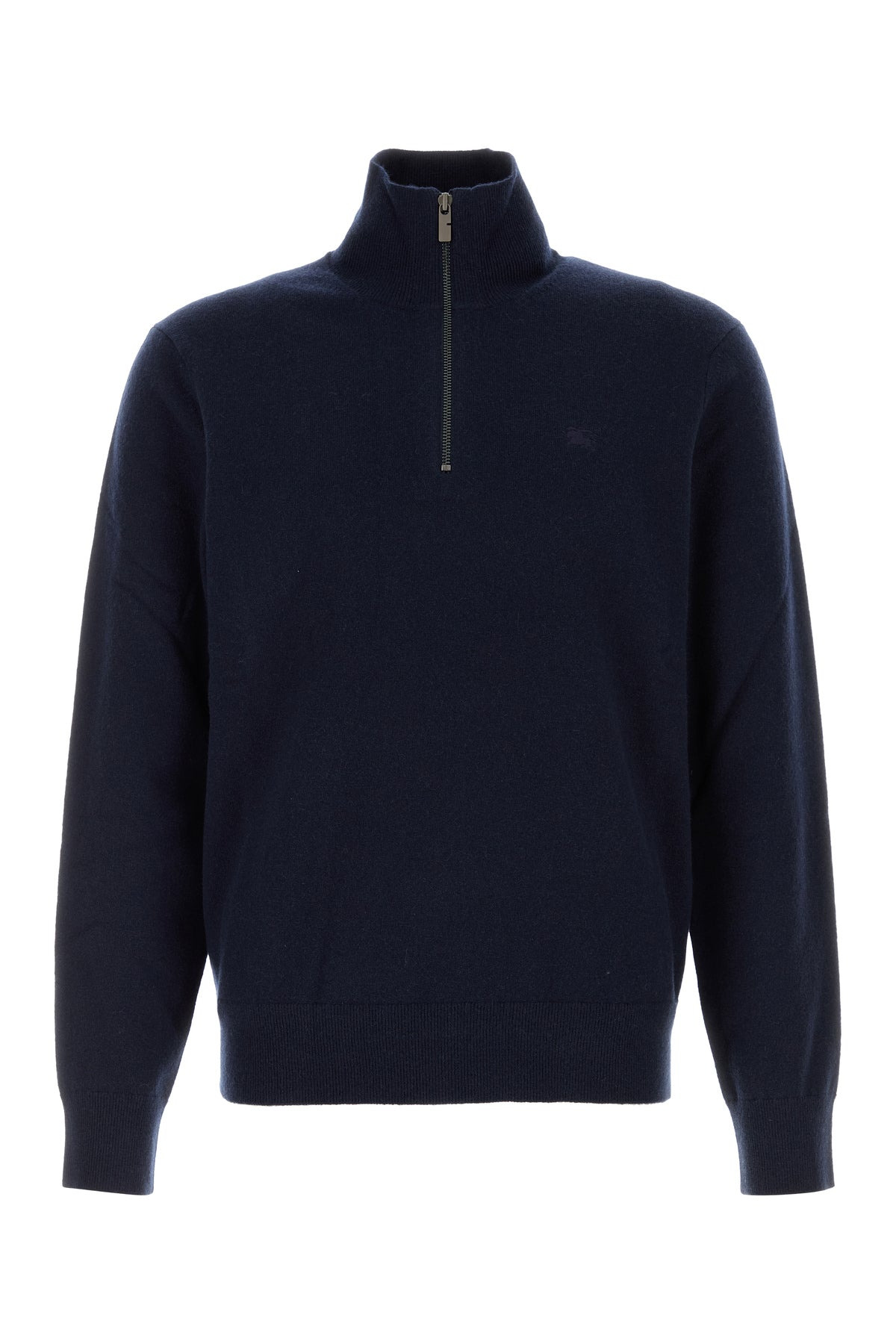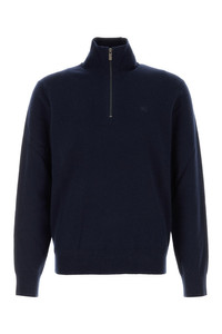 Sweater realized in stretch cashmere blend characterized by mock turtleneck. - Partial zip closure - Ribbed cuffs and hemline DETAILS Dark blu stretch cashmere blend sweater Exterior: 96% Cashmere 3% Nylon 1% Elastane Made in china Sample size: M