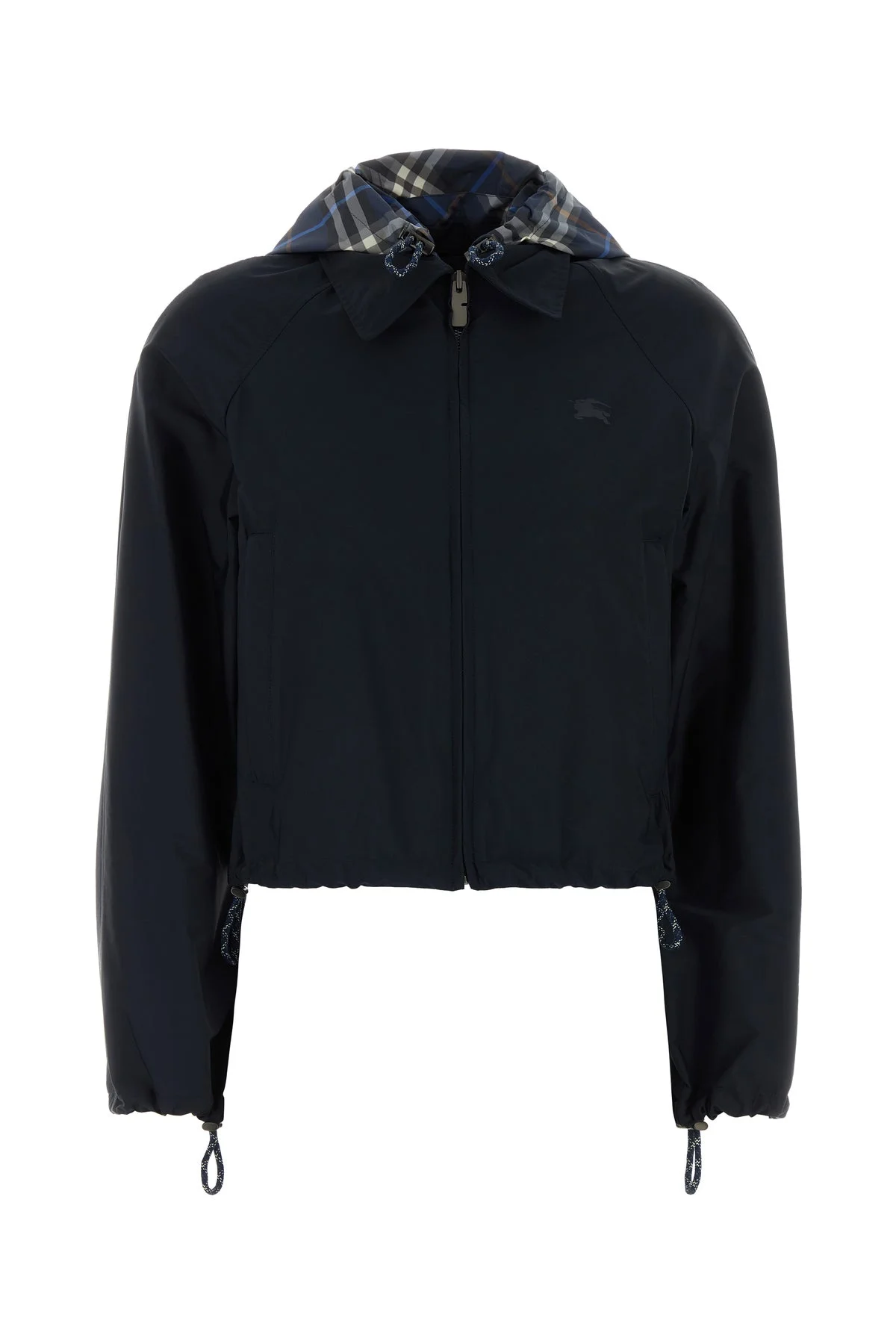 Cropped-cut jacket realized in stretch nylon characterized by tonal Equestrian Knight print on the chest. - Detachable Burberry Check motif hood with drawstring - Pointed collar - Concealed zip closure - Two zip pockets at the front - Drawstring on the cuffs and on the hemline - Unlined DETAILS Dark blue stretch nylon Newcott jacket Exterior: 92% Nylon 8% Elastane Made in thailand Sample size: XS
