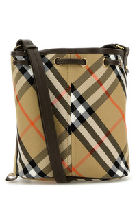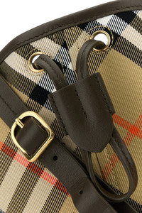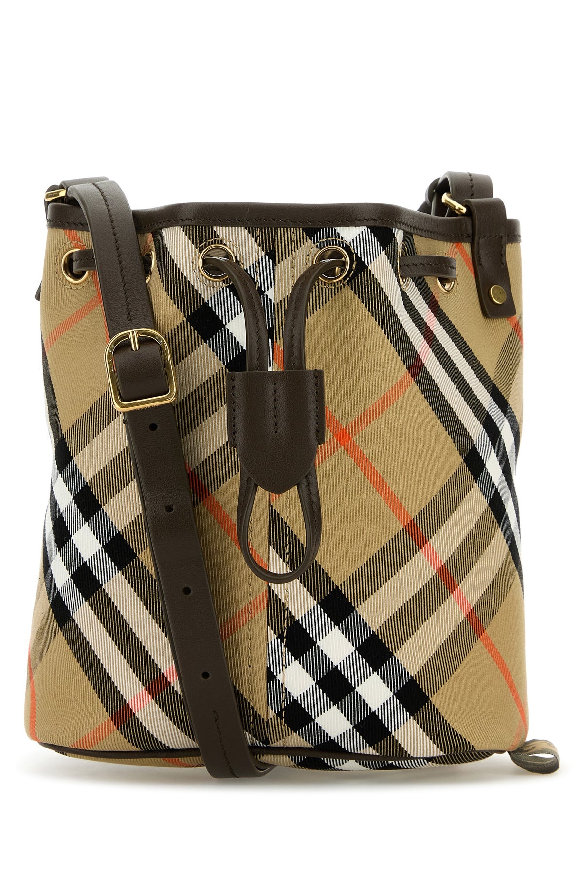 Bucket bag realized in pure cotton canvas characterized by Burberry Check embroidery on the entire surface. - Adjustable leather shoulder strap - Drawstring closure - Unlined DETAILS Embroidered canvas bucket bag Exterior: 100% Cotton Finishing: Golden metal Made in italy Width: 18 cm Height: 20 cm Depth: 10 cm Min shoulder strap length: 33 cm Max shoulder strap length: 37 cm