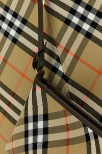 Shopping bag realized in pure cotton canvas characterized by Check motif embroidery on the entire surface. - Built-in handles - Snap button closure - Unlined interior with a detachable embroidered pouch DETAILS Embroidered canvas medium Check shopping bag Exterior: 100% Cotton Finishing: Golden metal Made in italy Width: 39 cm Height: 32 cm Depth: 19 cm Handle height: 21 cm