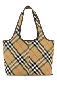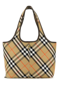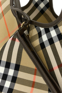 Shopping bag realized in canvas characterized by Burberry Check embroidery on the entire surface. - Two built-in handles - Snap button closure - Unlined interior with a detachable pouch DETAILS Embroidered canvas small Check shopping bag Exterior: 100% Cotton Finishing: Golden metal Made in italy Width: 41 cm Height: 14 cm Depth: 26 cm Handle height: 27 cm