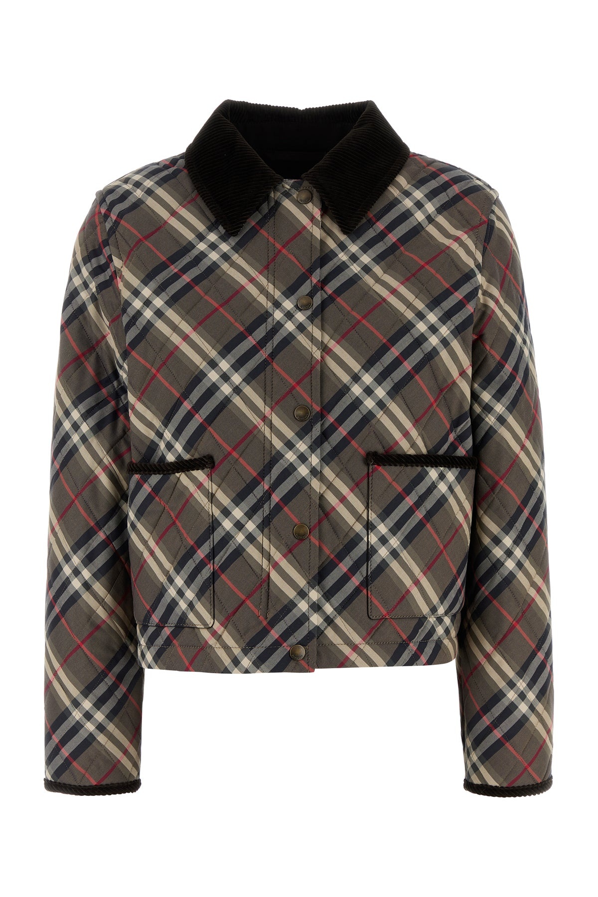 Jacket realized in quilted pure cotton characterized by Burberry Check embroidery on the entire surface enriched by Equestrian Knight label on the side. - Corduroy collar - Concealed zip and snap buttons closure - Two patch pockets at the front - Lined interior with a patch pocket DETAILS Embroidered cotton jacket Exterior: 100% Cotton Lining: 100% Cotton Padding: 100% Polyester Made in uk Sample size: XS