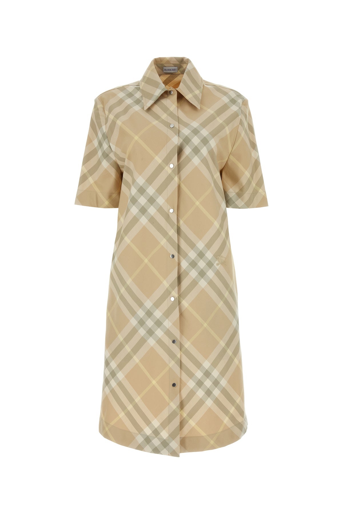 Shirt dress realized in pure cotton characterized by Burberry Check embroidery on the entire surface and Equestrian Knight embroidery at the front. - Collar - Snap buttons closure at the front - Seam pockets - Buttoned strap at the back - Unlined DETAILS Embroidered cotton shirt dress Exterior: 100% Cotton Made in romania Model is 178 cm and is wearing a size 4